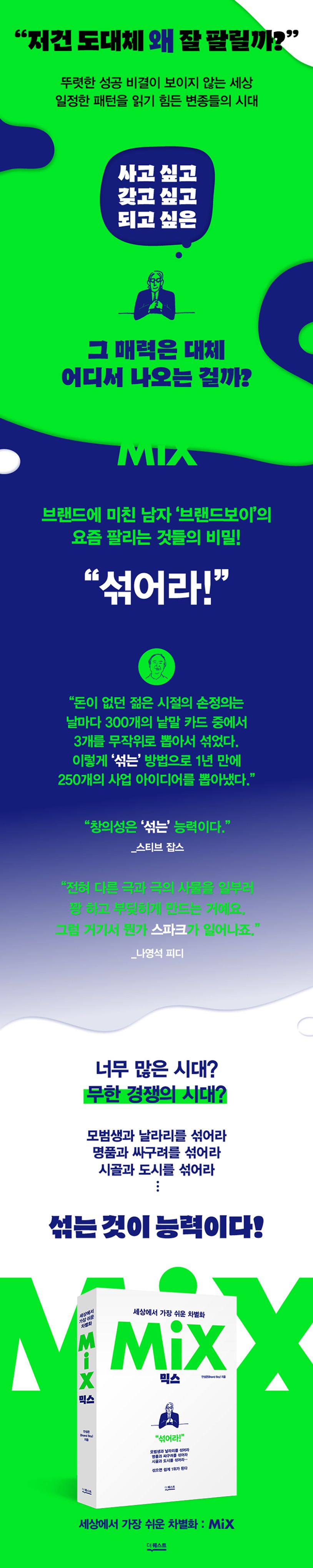 브랜드보이는 10년 넘게 광고 기획자, 브랜드 마케터로 일해오면서 수많은 히트작을 관찰하고 또 만들었다. 그 과정에서 이 세상의 히트작과 성공의 중심에 ‘믹스(Mix)’ 전략이 있음을 발견했다. 따로 떼어놓고 보면 도무지 어울릴 법하지 않은 것들도 막상 붙여보면 놀랍도록 멋진 결과물이 나온다. 지금껏 보지 못한 ‘낯선’ 물건이 탄생하고, ‘차별화’ 이루고, 열광하는 ‘팬’을 만든다.