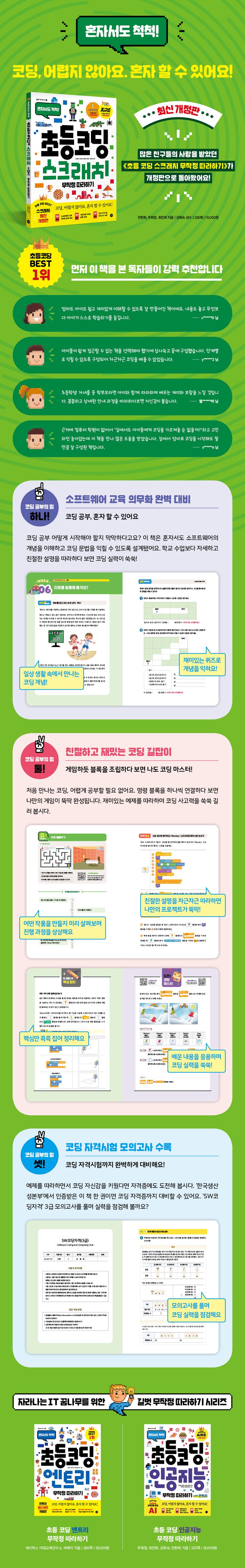 코딩 공부, 어떻게 시작해야 할지 걱정하지 마세요! 이 책은 학생 혼자서도 충분히 소프트웨어 개념을 이해하고, 코딩 문법을 익힐 수 있도록 설계되었어요. 일상 생활 속 예시를 통해 소프트웨어의 기초 개념을 다진 후, 게임처럼 재미있는 예제를 따라하며 코딩 실력을 쑥쑥 길러요. 학교 수업보다 자세하고 친절하게 알려주니 걱정은 그만! 초등 교과 과정에 충실한 15주 구성을 따라 코딩 학습을 시작해 보세요. ‘한국생산성본부’에서 인증한 ‘SW코딩자격’ 3급의 모의고사를 제공하므로 코딩 자격증에도 완벽하게 대비할 수 있어요.