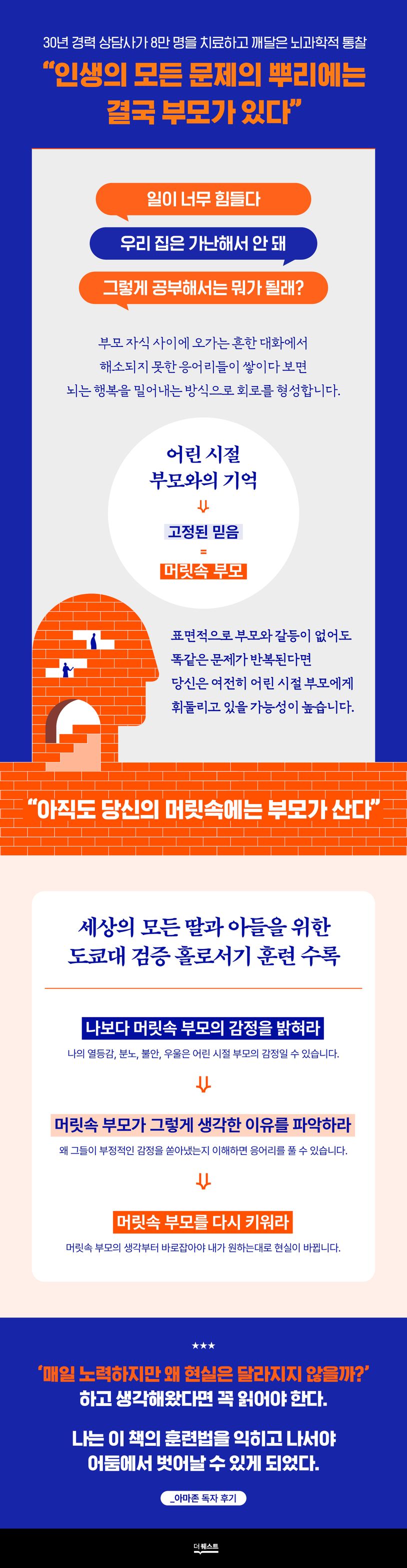 30년 동안 뇌과학, 신경언어프로그래밍(NLP) 등을 기반으로 다양한 사람들을 도와주던 저자는 어느 날 고민에 빠진 사람들에게 ‘부모’라는 공통점이 있다는 사실을 깨달았다. 부모와 큰 갈등이 없는 사람도, 어린 시절 트라우마가 없는 사람도 모두 머릿속에서는 여전히 부모에게서 휘둘리고 있었다.