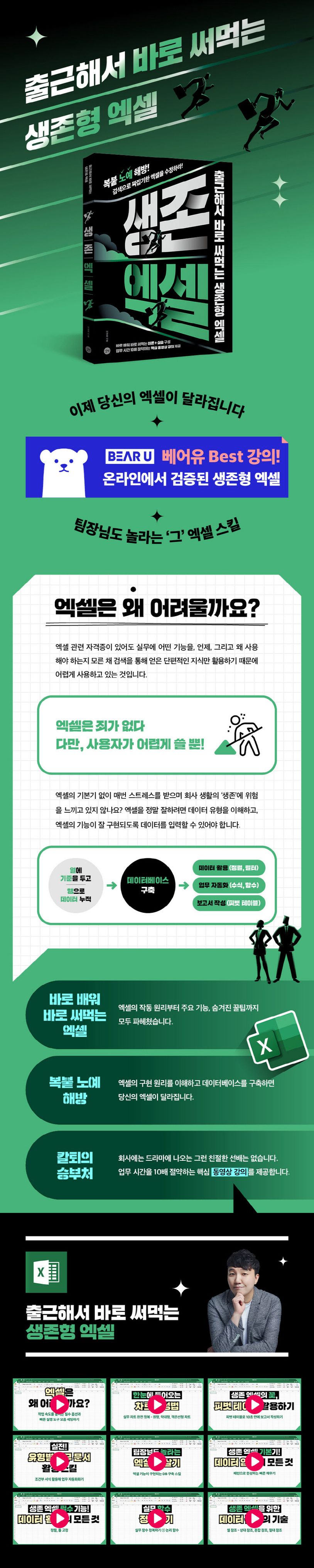 엑셀의 작동 원리부터 주요 기능, 숨겨진 꿀팁까지 모두 파헤쳤습니다. 이론+실습 구성으로 완성한 업무 밀착형 생존 엑셀을 만나보세요.