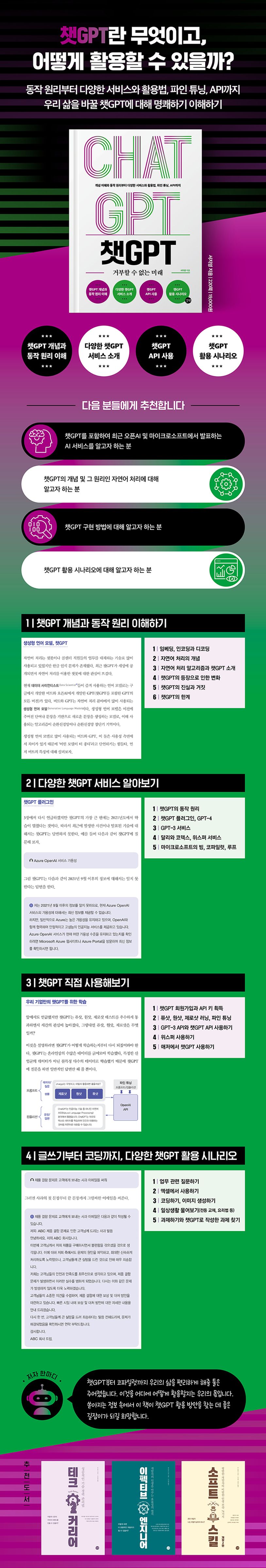 챗GPT 열풍이 뜨겁다. 챗GPT란 무엇이고, 어디에 어떻게 활용할 수 있는 걸까? 챗GPT의 동작 원리를 이해하려면 먼저 자연어 처리 개념을 이해해야 한다. 이 책은 자연어 처리 개념과 챗GPT의 동작 원리부터 설명하며, 새로 발표된 GPT-4를 비롯하여 챗GPT 플러그인, 달리, 코덱스, 위스퍼, 마이스코소프트의 빙, 코파일럿, 루프 등을 소개한다. 또한, 일반적인 챗GPT 사용법부터 마이크로소프트 애저에서 챗GPT를 사용하는 법, 위스퍼 사용법, 챗GPT API를 사용해 우리 기업만의 챗GPT를 만드는 법까지 담고 있다. 질문하기, 코딩, 엑셀, 이미지 생성, 과제 생성과 찾기 등 다양한 활용법도 다룬다. 각 내용마다 간단한 실습을 직접 해볼 수 있으며, 챗GPT를 어떻게 활용하면 좋을지 고민하는 분들에게 가이드가 되길 바란다.