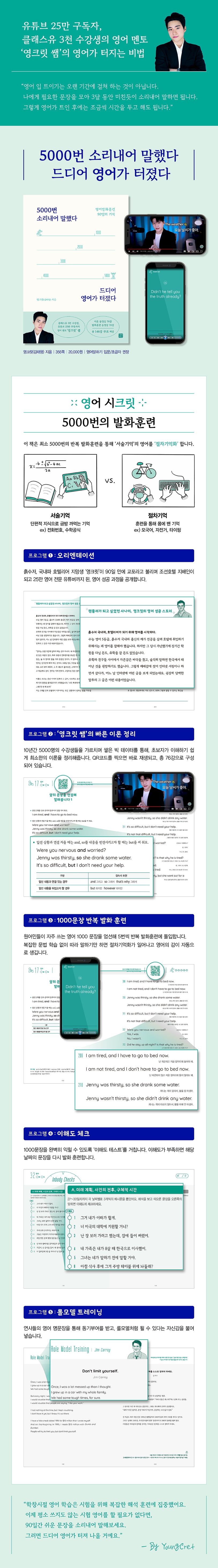 이 책에서는 영어를 ‘절차기억화’하기 위해 1000문장을 5번씩, 5000번의 발화훈련을 하게 된다, 영크릿 쌤의 짧은 강의 영상과 더불어 훈련 동영상도 함께 제공해 중도 포기 없이 따라 할 수 있도록 했다. 복잡한 문법 학습 없이 프로그램을 따라 말하기만 하면 절차기억화가 일어나 영어의 감이 자동으로 생긴다.