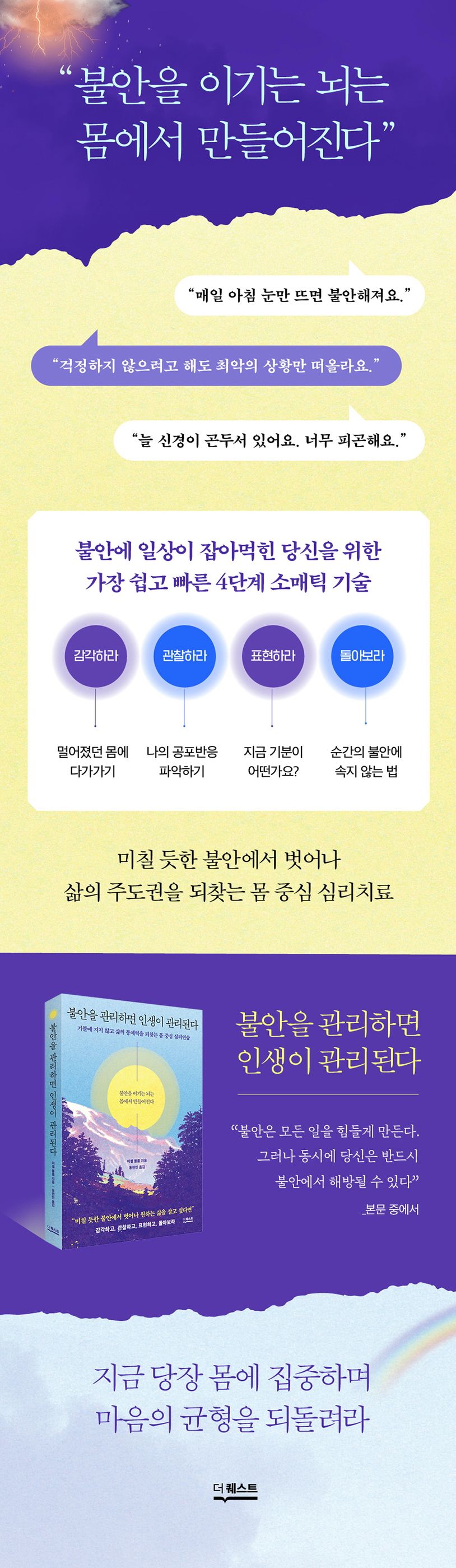 그러나 당신은 반드시 불안에서 해방될 수 있다. 그것도 빠르게, 동시에 근본적으로 말이다. 해답은 다름 아닌 우리 ‘몸’에 있다. 몸에는 인지적 접근만으로는 다가갈 수 없는 불안의 씨앗이 새겨져 있다. 아무리 멘탈을 길러도 자꾸만 반복되는 불안이 ‘몸’에 집중하면 진정으로 치유되기 시작한다. 내가 나약하거나 잘못된 것이 아니라 불안의 근본적인 원인, 불안을 부추기고 지속시키는 패턴을 파악하지 못했을 뿐이다. 이 책은 불안을 쉽고 빠르게 달래고, 동시에 불안의 뿌리를 찾아 일상을 회복하고 싶은 사람들을 위해 현실적인 치료법을 제시한다.