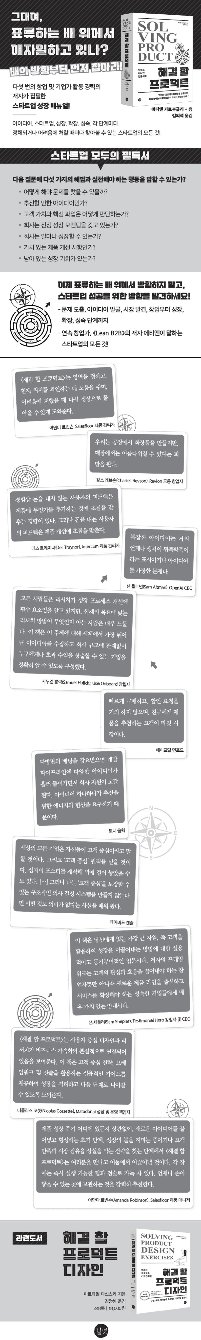 27. 〈해결 할 프로덕트〉는 처음부터 끝까지 읽는 책이 아니다. 프로덕트 성장 사이클 5단계에 따라 필요한 부분부터 찾아보면 된다. 각 장에는 즉시 실행 가능한 팁과 전술로 가득 차 있다. 언제나 손이 닿을 수 있는 곳에 보관하라.