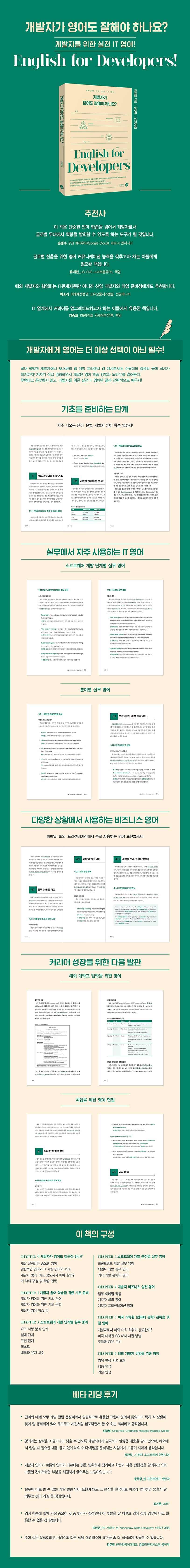 영어는 개발자에게 개발자 커리어를 성장시킬 수 있는 기회를 주는 동시에 개발 생산성을 향상시키는 도구가 되었다. 급변하는 IT 업계에서 최신 개발 트렌드를 빠르게 따라갈 수 있게 도와 주기도 한다. 이렇듯 이제 영어는 개발만큼 중요해졌다. 개발 역량 향상은 물론 오픈 소스 커뮤니티 참여, 해외 개발자 취업까지 한 단계 더 성장하고 싶을 때 영어는 강력한 무기가 될 것이다. 이 책은 소프트웨어 개발과 관련된 영어 학습을 목표로 하며, 소프트웨어 개발자가 영어를 능숙하게 활용할 수 있도록 돕는 것이 주요 목적이다. 국내 평범한 개발자에서 보스턴의 웹 개발 프리랜서 겸 매사추세츠 주립대의 컴퓨터 공학 석사가 되기까지 저자가 직접 경험하면서 깨달은 영어 학습 방법과 노하우를 담았다. 개발자가 많이 사용하는 어휘와 용어부터 IT분야별 영어 표현과 비즈니스 메일 작성법까지, 지금 당장 써먹을 수 있는 실전 IT 영어를 배워보자.