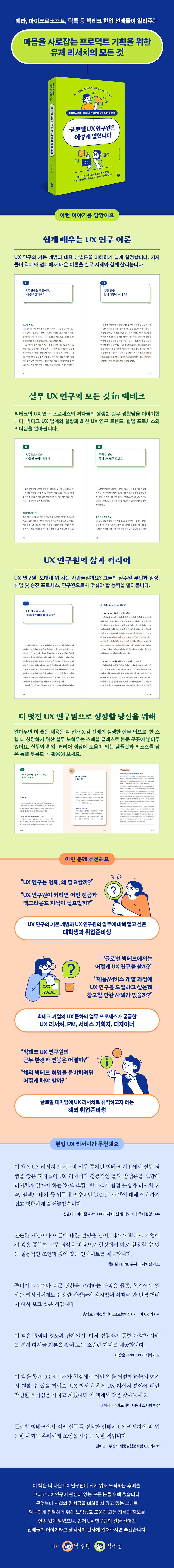 코어 프로덕트 포지션이 아닌 만큼 아직까지 많은 기업에서 채용하고 있지는 않지만, 제품의 성패는 결국 사용자가 사용하는지의 여부에 달려있습니다. 필자들은 메타, 마이크로소프트, 틱톡 등 다양한 글로벌 빅테크에서의 경험을 통해 사용자에 대한 이해와 그들의 목소리를 듣는 일의 중요성을 몸소 느껴왔습니다. 특히 앞으로 UX 연구 분야의 발전이 기대되는 한국에서 실무에 대한 인사이트를 제공하는 책이 필요하다고 판단하여 이 책을 집필하게 되었습니다.