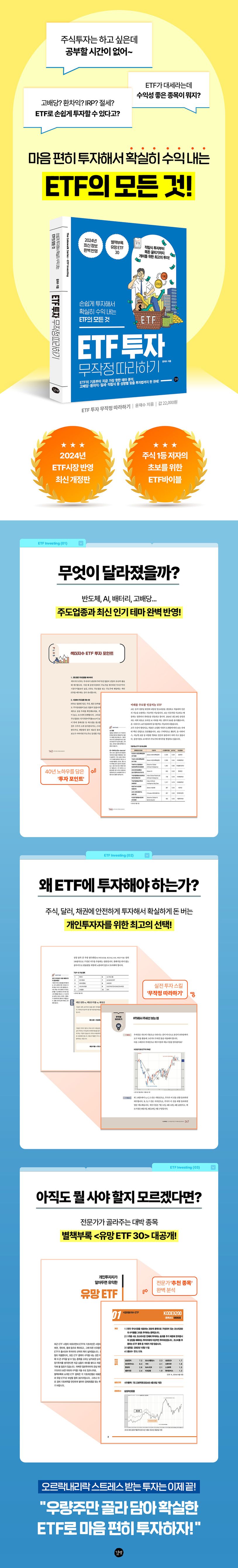 지난 16년간 'ETF 투자의 바이블'로서 독자들에게 사랑받은 《ETF 투자 무작정 따라하기》가 ETF시장의 빠른 성장과 함께 확 바뀐 ETF 투자의 모든 것을 완벽 반영해 2024년 개정판으로 돌아왔다. 이 책은 스케일이 달라진 ETF시장의 최신 정보를 모두 업데이트했을 뿐만 아니라 반도체, AI, 배터리, 메타버스 등 오늘날 가장 핫한 주도업종과 인기 테마에 대한 분석을 대폭 추가·수정했다. 점점 다양해지는 ETF의 종류와 특징부터 종목 선정법, 투자포인트, 개인퇴직연금계좌를 활용한 ETF 투자 전략이 모두 담겨 있는 이 책은 초보 투자자도 무작정 수익 낼 수 있는 ETF 투자의 완전판이다!