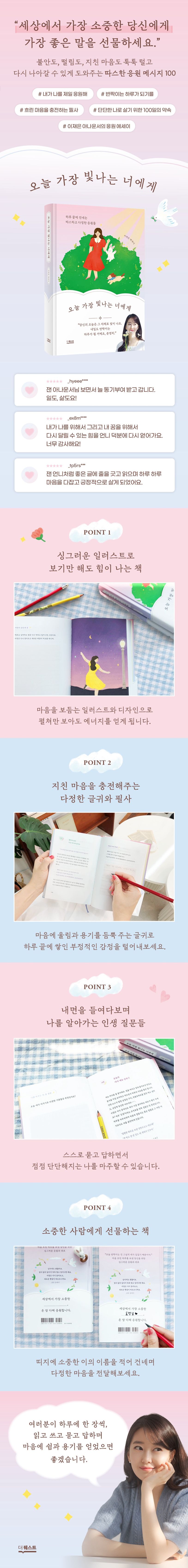 《오늘 가장 빛나는 너에게》는 MBC 이재은 아나운서의 첫 에세이이자 필사집이다. 다정하고 긍정적이기로 유명한 저자도 힘든 순간들, 주저앉고만 싶은 날들이 꽤 있었다. 이 책은 저자가 힘들고 지쳤을 때 마음을 충전하기 위해 읽었던 여러 글 중에서 특히 좋았던 글 100편을 모아 자신의 생각과 함께 정리한 것이다. 책 속에는 아름다운 글들과 함께 독자들이 그 글을 읽은 후 직접 쓰고 묻고 답하는 공간도 마련되어 있다.