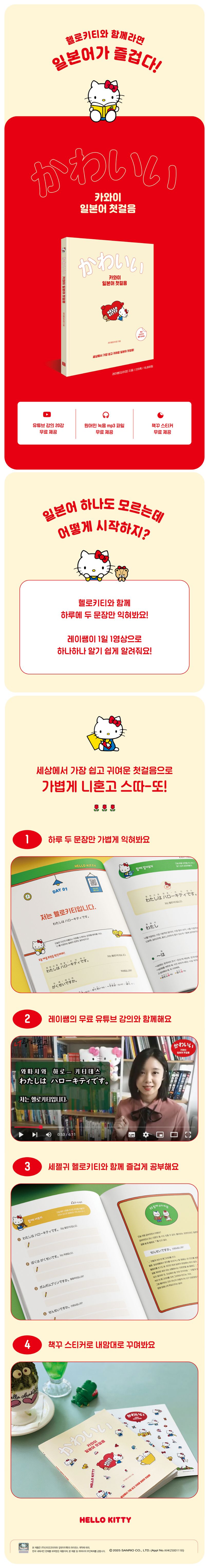 헬로키티랑 즐겁게 일본어 공부할 사람 다 모여라! 세상에서 가장 쉽고 귀여운 일본어 입문서 《카와이 일본어 첫걸음》이 출간되었다. 하루에 딱 두 문장만 배우면 끝나는 심플한 학습 구성으로 누구나 부담 없이 일본어를 공부할 수 있도록 만든 것이 이 책의 가장 큰 특징이다. 또한 저자 레이쌤의 핵심 강의를 무료로 제공하여 혼자서 공부하기 어려워하는 학습자들도 차근차근 따라올 수 있도록 배려했다. 2024년 탄생 50주년을 맞은 산리오의 대표 캐릭터 헬로키티와의 콜라보로 탄생한 도서로 책 곳곳에서 헬로키티의 사랑스러움과 귀여움을 한가득 맛볼 수 있다. 추가적으로 헬로키티 책꾸 스티커를 제공하여 나만의 책으로 꾸며보는 즐거움을 제공한다. 일본어를 배우고 싶다면, 헬로키티를 좋아한다면, 부담 없이 즐겁게 공부하고 싶다면! 《카와이 일본어 첫걸음》이 기분 좋은 선택지가 될 것이다.
