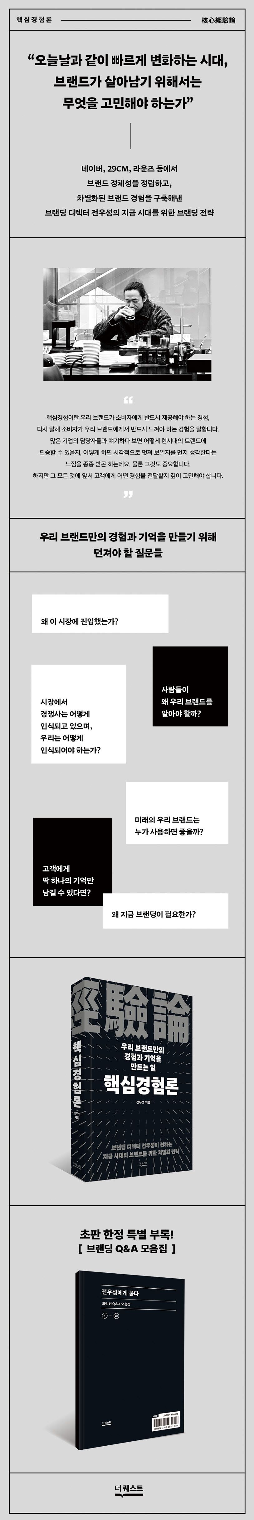 브랜딩은단지홍보문구를잘짜거나디자인을잘하는등의스킬적인부분만있는게아니라,소비자와기능적·감성적관계를맺고기억에남는경험을설계하는일이다.그만큼복잡하고어려운일이기에하나의공식으로정의할수없다.사람사이의관계를만드는데에공식이없듯,브랜딩에도정해진길은없다.그러나고민해봐야할지점들은분명존재한다.《핵심경험론》은그지점들을제안하고우리브랜드만의특별함을찾는과정을돕기위한가이드다.