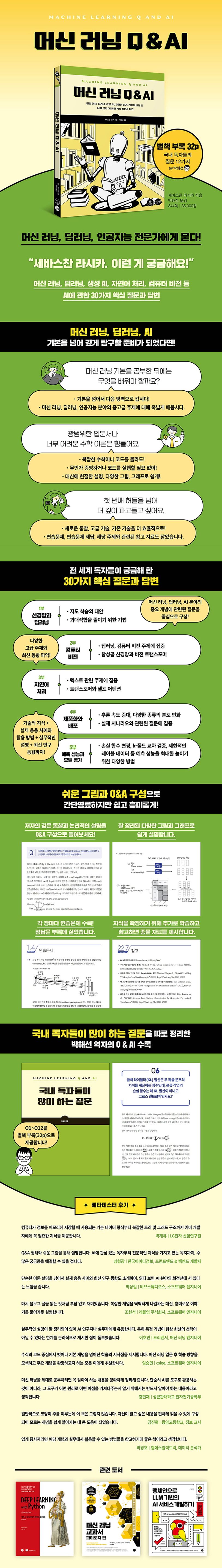 이 책은 인공지능 분야의 선두에 서 있는 세바스찬 라시카 박사가 자주 받는 질문에 대해, Q&A라는 독특한 스타일을 사용해 설명한 책이다. 신경망과 딥러닝, 컴퓨터 비전, 자연어 처리, 생성 AI, 예측 성능과 모델 평가 등 다양한 인공지능 분야를 저자의 깊이 있는 고찰과 논리적인 설명으로 더욱 심도 있게 이해할 수 있다. 기본적인 이론 설명을 넘어서 기술 관련 지식, 활용 방법, 실무적인 설명을 정리하고 최신 연구 동향을 소개하면서, 연습문제와 연습문제에 대한 해답, 참고하면 좋을 자료들도 함께 수록했다. 또한 마찬가지로 국내 인공지능 분야에서 활발히 활동하고 있는 박해선 역자 역시 이 책을 번역하면서 국내 독자들에게 자주 받은 질문 12개에 대한 Q&A를 권말부록으로 집필해 실었다. 전반적인 인공지능 분야의 지식을 한 단계 업그레이드하고자 하는 분들에게 도움이 되기를 바란다.