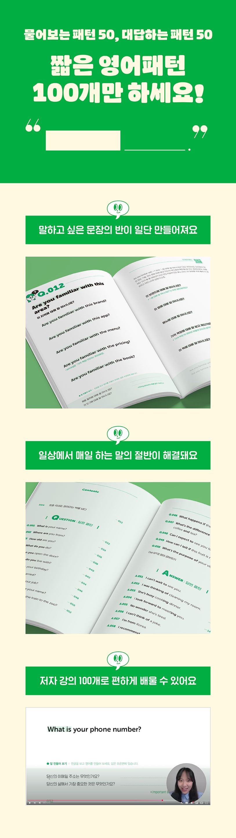 첫째, 짧고 쉬운 패턴 100개를 질문과 답변 패턴으로 나눠서 초보학습자도 이 책만 보면 영어로 묻고 답을 할 수 있게 구성했다. 어떤 어려운 주제로 얘기를 한다고 해도 대화는 일단 묻고 답하는게 전부이다. 간단한 패턴이지만 이 책에 실린 패턴만 잘 학습해도 영어회화를 할 수 있게 구성했다.