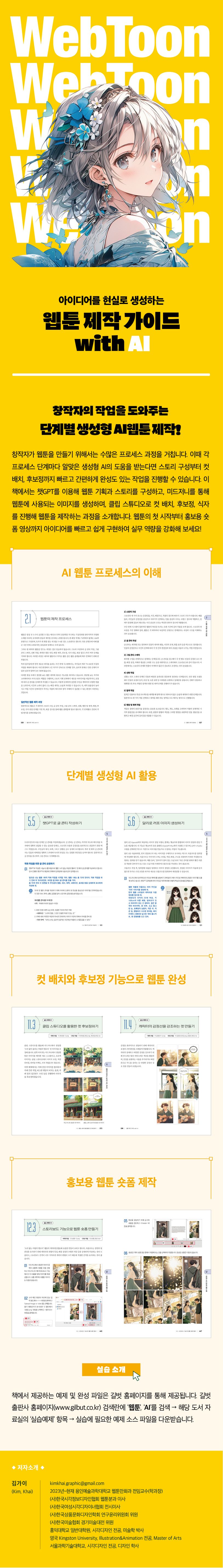 《아이디어를 현실로 생성하는 웹툰 제작 가이드 with AI》는 웹툰에 익숙하지 않은 초보자부터 더욱 효율적인 창작 방식을 원하는 작가까지 누구나 실질적으로 따라할 수 있도록 실습 중심의 예제들로 구성한 책입니다.