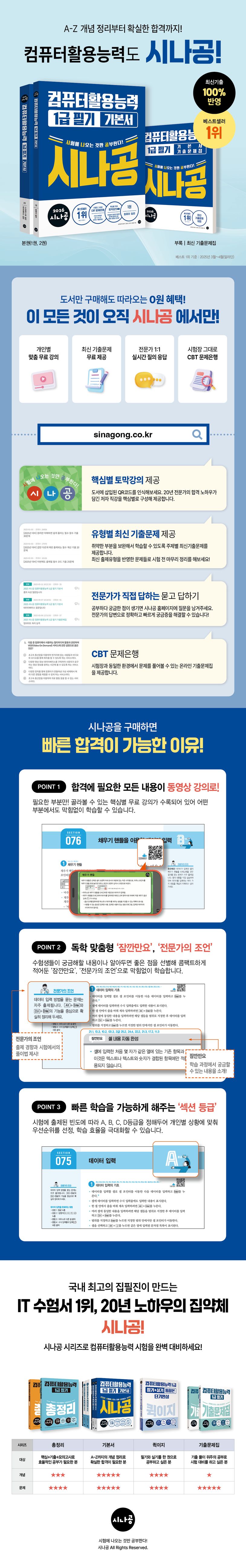 <시나공>에서만만날수있는합격비법-꼼꼼하고확실한개념정리:철저한분석으로출제개념을구성해확실한시험대비가가능합니다.-이론+문제+요약의3단구성:각섹션과장이끝날때마다기출문제와핵심요약을배치해필수학습이론을완벽하게흡수할수있도록만들었습니다.-섹션등급을통한선별학습:시험에출제된빈도에따라A,B,C,D등급을정해두어개인별상황에맞춰우선순위를선정,학습효율을극대화할수있습니다.-책속의또하나의책!기출문제집제공:총10회최신기출문제를제공합니다.-저자무료강의지원:유튜브와홈페이지에서핵심별저자무료강의를제공합니다.-꾸준히업데이트되는최신자료:시나공홈페이지(sinagong.co.kr)에서핵심요약집,최신기출문제등시험에필요한자료를확인할수있습니다.수험생의마음으로만든책-시나공최대한단시간에취득할수있도록노력했습니다.자격증취득을목적으로구성된만큼이론상중요할지라도시험문제와거리가있는내용은배제했습니다.또지금까지출제된모든기출문제를유형별로분석하여합격이가능한수준을정한후,출제비중이낮은내용은과감히빼고중요한것은확실하게표시해둠으로써어떠한변형문제가나오더라도대처할수있도록최대한자세하고쉽게설명했습니다.공부하면서답답함을느끼지않도록노력했습니다.컴퓨터활용능력필기시험은이론시험이지만많은문제가윈도우10과엑셀,액세스의기능을알아야만풀수있는문제가출제됩니다.이런문제들을풀기위해프로그램의기능들을무조건외우는것은무척피곤한일입니다.실습이필요한내용은컴퓨터화면을보면서따라할수있도록단계별로자세한설명을추가해이분야에전혀기초가없는수험생도학습할수있도록눈높이를맞췄습니다.학습방향을제시하기위해노력했습니다.학습방향을파악하지못한채교재에수록된내용을무작정읽어가는것은비효율적입니다.실제시험에서출제되는문제에맞게암기할것,한번만읽어볼것,구분할것,이해할것,실습할것등옆에서선생님이지도하는것처럼친절한가이드라인을제공합니다.동영상강의를제공합니다.시나공컴퓨터활용능력1급필기교재는컴퓨터관련초보자도수월하게공부할수있도록자세하고쉬운설명으로구성되어있지만,수험생의상황에따라학습에어려움을느낄수있습니다.이런분들을위해교재내용의어려운부분을동영상강의로제공합니다.본문의QR코드를스캔하면명쾌하고시원한저자직강동영상강의로막힘없이학습을이어갈수있습니다.-시나공FAQ-Q.시나공홈페이지에서어떤자료를받아볼수있나요?A.시나공홈페이지에서는자격증별로제공되는강의외에도여러시험대비자료를받아보실수있습니다.새로운기출문제및모의고사가꾸준히업데이트되며,실습파일,핵심요약집을비롯하여실기특강과다양한강의가제공됩니다.자격증종목을선택한후,구매도서에맞는자료를내려받아학습하세요.Q.도서명앞에년도가붙는이유는무엇인가요?작년판과차이점이무엇이죠?A.시나공앞에년도가붙는이유는전년도시험경향을완벽하게반영했음을나타내기위해서입니다.시나공은멈춰있지않고매년변화하는시험문제와유형,출제경향에맞춰같이나아갑니다.Q.실기시험에서시행처에서사용하는버전이MSOfficeLTSC2021라고하던데,가정에서사용하는OfficeProfessional버전과의차이점이뭔가요?A.MSOfficeLTSC는기업용라이선스로개인적으로는사용이어렵습니다.시나공도서는시험장환경에맞춰LTSC2021버전으로제작되었습니다.따라서가정에서사용하는OfficeProfessional버전으로보는화면과도서내표기가다를수있습니다.해당부분은<전문가의조언>을통해차이점을안내하고있으므로학습하시는데전혀지장이없습니다.