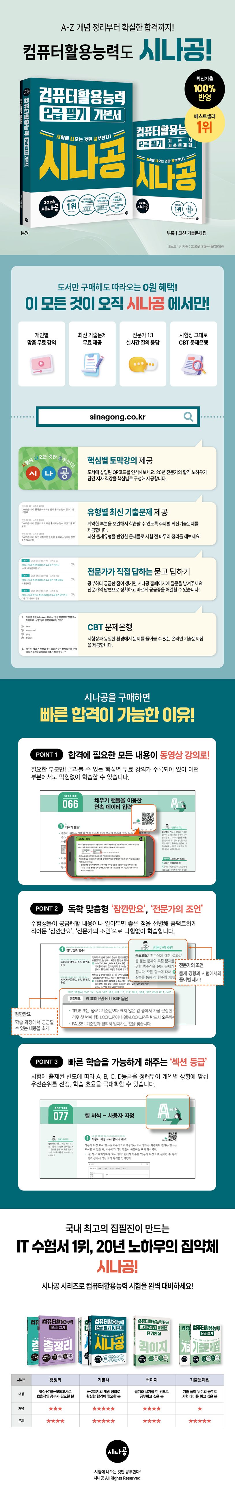 ■<시나공>에서만만날수있는합격비법-꼼꼼하고확실한개념정리:철저한분석으로출제개념을구성해확실한시험대비가가능합니다.-이론+문제+요약의3단구성:각섹션과장이끝날때마다기출문제와핵심요약을배치해필수학습이론을완벽하게흡수할수있도록만들었습니다.-섹션등급을통한선별학습:시험에출제된빈도에따라A,B,C,D등급을정해두어개인별상황에맞춰우선순위를선정,학습효율을극대화할수있습니다.-책속의또하나의책!기출문제집제공:총10회최신기출문제를제공합니다.-저자무료강의지원:유튜브와홈페이지에서핵심별저자무료강의를제공합니다.-꾸준히업데이트되는최신자료:시나공홈페이지(sinagong.co.kr)에서핵심요약집,최신기출문제등시험에필요한자료를확인할수있습니다.수험생의마음으로만든책-시나공■최대한단시간에취득할수있도록노력했습니다.자격증취득을목적으로구성된만큼이론상중요할지라도시험문제와거리가있는내용은배제했습니다.또지금까지출제된모든기출문제를유형별로분석하여합격이가능한수준을정한후,출제비중이낮은내용은과감히빼고중요한것은확실하게표시해둠으로써어떠한변형문제가나오더라도대처할수있도록최대한자세하고쉽게설명했습니다.■공부하면서답답함을느끼지않도록노력했습니다.컴퓨터활용능력필기시험은이론시험이지만많은문제가윈도우10과엑셀의기능을알아야만풀수있는문제가출제됩니다.이런문제들을풀기위해프로그램의기능들을무조건외우는것은무척피곤한일입니다.실습이필요한내용은컴퓨터화면을보면서따라할수있도록단계별로자세한설명을추가해이분야에전혀기초가없는수험생도학습할수있도록눈높이를맞췄습니다.■학습방향을제시하기위해노력했습니다.학습방향을파악하지못한채교재에수록된내용을무작정읽어가는것은비효율적입니다.실제시험에서출제되는문제에맞게암기할것,한번만읽어볼것,구분할것,이해할것,실습할것등옆에서선생님이지도하는것처럼친절한가이드라인을제공합니다.■동영상강의를제공합니다.시나공컴퓨터활용능력2급필기교재는컴퓨터관련초보자도수월하게공부할수있도록자세하고쉬운설명으로구성되어있지만,수험생의상황에따라학습에어려움을느낄수있습니다.이런분들을위해교재내용의어려운부분을동영상강의로제공합니다.본문의QR코드를스캔하면명쾌하고시원한저자직강동영상강의로막힘없이학습을이어갈수있습니다.-시나공FAQ-Q.시나공홈페이지에서어떤자료를받아볼수있나요?A.시나공홈페이지에서는자격증별로제공되는강의외에도여러시험대비자료를받아보실수있습니다.새로운기출문제및모의고사가꾸준히업데이트되며,실습파일,핵심요약집을비롯하여실기특강과다양한강의가제공됩니다.자격증종목을선택한후,구매도서에맞는자료를내려받아학습하세요.Q.도서명앞에년도가붙는이유는무엇인가요?작년판과차이점이무엇이죠?A.시나공앞에년도가붙는이유는전년도시험경향을완벽하게반영했음을나타내기위해서입니다.시나공은멈춰있지않고매년변화하는시험문제와유형,출제경향에맞춰같이나아갑니다.Q.실기시험에서시행처에서사용하는버전이MSOfficeLTSC2021라고하던데,가정에서사용하는OfficeProfessional버전과의차이점이뭔가요?A.MSOfficeLTSC는기업용라이선스로개인적으로는사용이어렵습니다.시나공도서는시험장환경에맞춰LTSC2021버전으로제작되었습니다.따라서가정에서사용하는OfficeProfessional버전으로보는화면과도서내표기가다를수있습니다.해당부분은<전문가의조언>을통해차이점을안내하고있으므로학습하시는데전혀지장이없습니다.