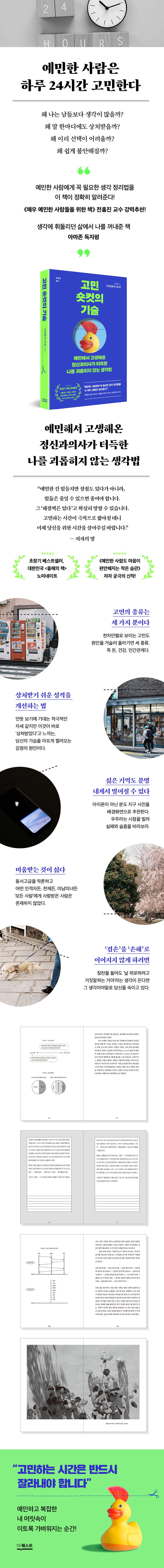 이처럼 복합적인 심리를 띠는 예민한 사람들의 고충을 투명하게 들여다보고 그에 맞는 정확한 조언을 건네는 것은 이 책의 힘이다. 저자는 불안에 좋다고 해서 온몸을 판자로 압박하는 ‘압박기구’까지 체험해볼 정도로 누구보다도 강박과 예민함에 시달려왔고, 예민한 사람이 생각에 휘둘려 시간을 허비하는 안타까움에 절실히 이 책을 썼다. 효과가 확실한 ‘고민 숏컷의 기술’을 통해 자신을 괴롭히기만 하는 생각을 시원하게 자르고, 남는 에너지를 당신의 더 소중하고 재밌고 행복한 일에 쓰자. 이제는 생각이 아니라 순간을 살자.