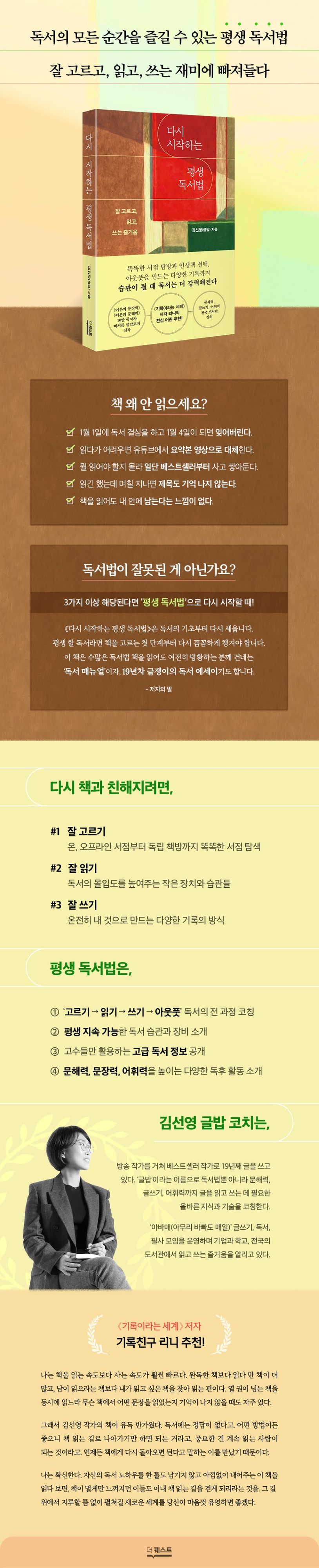 《어른의 문장력》과 《어른의 문해력》 등 10만 독자의 읽고 쓰기를 책임져온 김선영 작가는 신작 《다시 시작하는 평생 독서법》을 통해 근본적인 독서의 방법을 처음부터 다시 시작하자고 제안한다. 책과 멀어진 이들이 다시 책과 가까워질 수 있도록, 베스트셀러 작가이자 오랜 독서가의 노하우를 아낌없이 쏟아부었다. 그래서 이름도 ‘평생 독서법’이다.