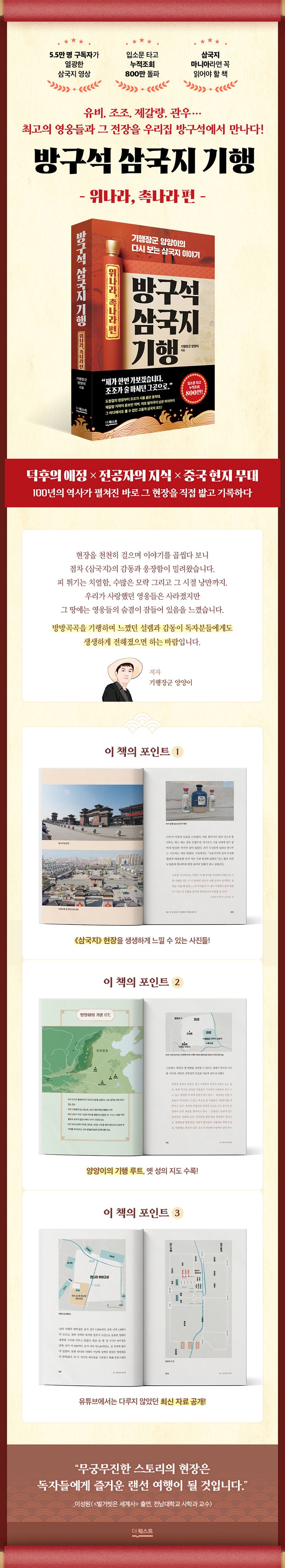 《삼국지》 마니아들의 시선을 단번에 사로잡을 역사 기행서, 《방구석 삼국지 기행(위나라, 촉나라 편)》이 출간되었다. 5.5만 명이 구독하는 유튜브 채널 ‘기행장군 양양이’를 운영하는 저자는 수년간 중국 전역을 답사하며 약 80여 곳의 《삼국지》 유적지를 기록해왔다. 《방구석 삼국지 기행(위나라, 촉나라 편)》은 그 여정을 집대성한 결과물로, 단순한 여행기나 유적 소개에 머물지 않고 《삼국지》 서사와 역사적 장소를 입체적으로 연결한다.