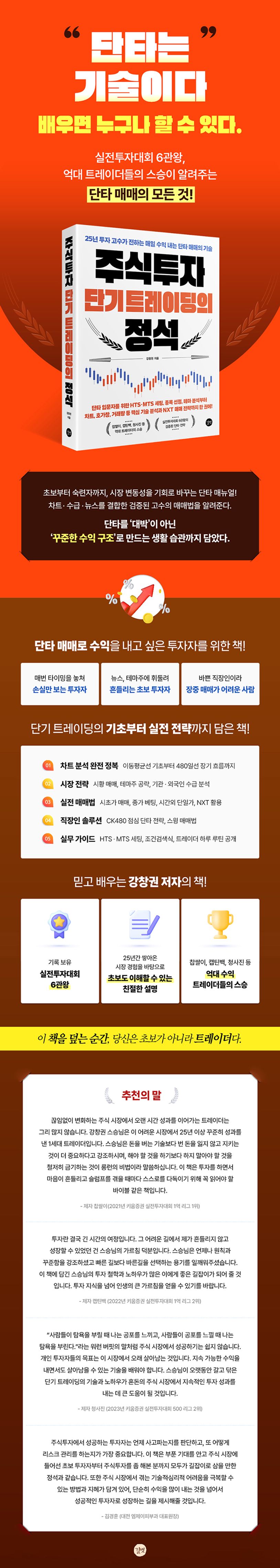 차트분석,이동평균선의기본개념을읽히고시황매매,테마주매매등을통해매수매도타이밍을잡는법이책에서는입문자는물론숙련된트레이더도헷갈려하는차트분석의핵심인이동평균선활용법의기초부터고급패턴까지체계적으로다룬다.5일선·10일선의단기매매부터480일선장기흐름까지,각라인별매수·매도타이밍을정밀하게짚어준다.또한시황매매,테마주매매,기관·외국인수급분석등시장변동성을활용하는전략도담겨있다.시초가매매,종가베팅,시간외단일가,넥스트레이드(NXT)등상황별맞춤매매법도구체적인진입·청산포인트와함께소개한다.특히이모든전략을설명하는데있어서저자의실전경험을곁들이고,이미입증된성과를보여주어이론에그치는것이아니라실전에바로써먹을수있는‘검증된무기’가될것이다.시간이없는직장인도가능한단기매매솔루션2024년3월조사결과에따르면대한민국국민의약4분의1이주식을보유하고있다고한다.그리고그중상당수가열심히일하면서투자하는직작인이다.이책은장중매매가어려운투자자를위해‘CK480점심단타전략’과기관수급을활용한스윙매매법을제시한다.HTS·MTS세팅,조건검색식활용,트레이더하루스케줄까지공개하며,책을덮는순간바로시장에서적용할수있도록했다.저자는“단기매매는한번의대박이아니라,매일쌓아가는안정적인수익구조”라고강조한다.이책을통해독자는시장을두려워하는초보에서,매일수익을지키는단타트레이더로성장하게될것이다.추천사끊임없이변화하는주식시장에서오랜시간성과를이어가는트레이더는그리많지않습니다.강창권스승님은이어려운시장에서25년이상꾸준히성과를낸1세대트레이더입니다.스승님은돈을버는기술보다번돈을잃지않고지키는것이더중요하다고강조하시며,해야할것을하기보다하지말아야할것을철저히금기하는것이롱런의비법이라말씀하십니다.이책은투자를하면서마음이흔들리고슬럼프를겪을때마다스스로를다독이기위해꼭읽어야할바이블같은책입니다.-제자찹쌀이(2021년키움증권실전투자대회1억리그1위)투자란결국긴시간의여정입니다.그어려운길에서제가흔들리지않고성장할수있었던건스승님의가르침덕분입니다.스승님은언제나원칙과꾸준함을강조하셨고빠른길보다바른길을선택하는용기를일깨워주셨습니다.이책에담긴스승님의투자철학과노하우가많은이에게좋은길잡이가되어줄것입니다.투자지식을넘어인생의큰가르침을얻을수있기를바랍니다.-제자캡틴백(2022년키움증권실전투자대회1억리그2위)“사람들이탐욕을부릴때나는공포를느끼고,사람들이공포를느낄때나는탐욕을부린다.”라는워런버핏의말처럼주식시장에서성공하기는쉽지않습니다.개인투자자들의목표는이시장에서오래살아남는것입니다.지속가능한수익을내면서도살아남을수있는기술을배워야합니다.스승님이오랫동안갈고닦은단기트레이딩의기술과노하우가혼돈의주식시장에서지속적인투자성과를내는데큰도움이될것입니다.-제자청사진(2023년키움증권실전투자대회500리그2위)주식투자에서성공하는투자자는언제사고파는지를판단하고,또어떻게리스크관리를하는지가가장중요합니다.이책은부푼기대를안고주식시장에들어선초보투자자부터주식투자를좀해본분까지모두가길잡이로삼을만한정석과같습니다.또한주식시장에서겪는기술적·심리적어려움을극복할수있는방법과지혜가담겨있어,단순히수익을많이내는것을넘어서성공적인투자자로성장하는길을제시해줄것입니다.-김경훈(대전엠제이피부과대표원장)