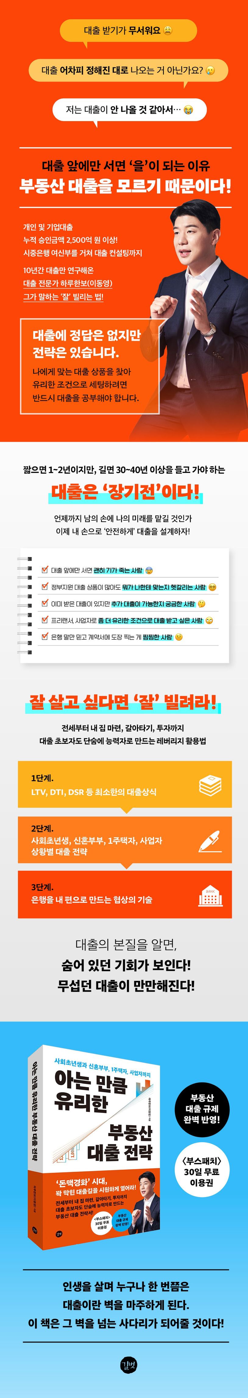 [여는글]단순하지만강력한비밀,성공하고싶다면빌려라----------------------------------------------1장대출의힘----------------------------------------------01한걸음나아가게만들어준대출[Tip]보험약관대출활용하기02로또청약이준패배감[Tip]모기지보험과방공제03대출이라는지름길04뒤처지지않으려면05돈은빚이다06대출과부동산의관계07금리가높아도,낮아도결국대출[대출상담사례]은혜갚은고금리----------------------------------------------2장최소한의대출상식----------------------------------------------08기본용어짚고가기[Tip]융자와대출의차이09대출의종류10제2금융권의활용과보증기관[Tip]대출은주거래은행에서?[Tip]대출상담사제대로활용하기11대면이유리할까,비대면이유리할까12변동금리와고정금리13대출은어떻게진행될까[Tip]직장인과사업자의소득심사기준14자금계획세우기[대출상담사례]전문가가필요한이유----------------------------------------------3장대출한도를결정짓는LTV,DTI,DSR----------------------------------------------15LTV,DTI,DSR이해하기[Tip]가중평균금리계산하기[Tip]DSR부채산정방식이해하기16상황에따라달라지는대출비율[Tip]규제지역과비규제지역17사이트이용해DSR계산하기18DSR을피하는세가지방법19겁먹을필요없는스트레스DSR20정부가대출을규제하는이유[대출상담사례]아는것이힘이다----------------------------------------------4장사회초년생과신혼부부를위한대출지식:전세부터내집마련까지----------------------------------------------21젊을수록유리한대출정책22종잣돈만드는전세대출정책23주택도시기금전세대출4대장[Tip]HF와HUG보증의차이[Tip]유주택자인데무주택자?24소중한내돈지키는전세보증금반환보증25내집마련을위한주택담보대출상품[Tip]보험사의주택담보대출상품은뭐가다를까26사례로보는주택담보대출활용법27청약당첨시알아야할대출포인트28혼인신고,해야할까말아야할까29같은듯다른분양권잔금대출30실무자만아는대출활용포인트[Tip]소득기준은왜보금자리론업무처리기준을따를까[Tip]대출도승계가될까31중고가아파트매수자와고연봉자들을위한팁[대출상담사례]선대출,후전세는분명가능하다----------------------------------------------5장1주택자에게더중요한대출지식:갈아타기부터추가매수까지----------------------------------------------32아는맛이무섭다33갈아타기전에꼭따져야하는여섯가지34계약금조차없는당신을위한전략35일시적2주택을유지하기위한전략36LTV를극복하는전략[Tip]다른지역에추가매수를하는경우37부족한전세보증금반환전략38대출갈아타기전략[Tip]대출은그대로두고목적물만변경할수있을까39투자와사업을준비하는1주택자를위한팁[대출상담사례]준비된자가기회를잡는다----------------------------------------------6장사업자를위한대출지식:사업자금마련부터투자까지----------------------------------------------40사업자대출활용전략41부동산임대업을꿈꾼다면[Tip]렌트프리로RTI세팅하기42경매와대출의시너지[Tip]경락잔금대출과정[Tip]경락잔금대출잘받는법431억~2억원으로건물주되기44오피스텔에투자하는방법[Tip]지식산업센터에투자하기45저금리무담보정책자금활용하기46사업자,프리랜서의소득인정금액높이는방법47무조건이것하나는있어야한다[대출상담사례]법인사업자로아파텔투자----------------------------------------------7장은행을내편으로만드는협상의기술----------------------------------------------48금리의구성을먼저파악하자[Tip]부수거래와꺾기영업49대출승인을부르는상담비법[Tip]내대출에적극적으로도움을줄은행원찾는방법50금융기관이추가정보를요청할때51상담후말이없는직원을움직이게하는방법52금리협상에도타이밍이있다53금리인하요구권활용하기54불가능을가능하게만드는힘[대출상담사례]포기란없다