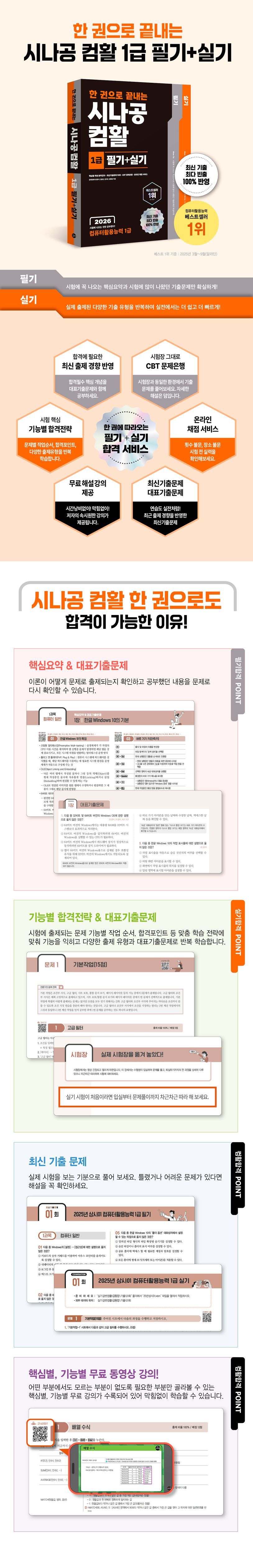 수험생의마음으로만든책시나공최대한단시간에취득할수있도록노력했습니다.자격증취득을목적으로구성된만큼이론상중요할지라도시험문제와거리가있는내용은배제했습니다.또지금까지출제된모든기출문제를유형별로분석하여합격이가능한수준을정한후,출제비중이낮은내용은과감히빼고중요한것은확실하게표시해둠으로써어떠한변형문제가나오더라도대처할수있도록최대한자세하고쉽게설명했습니다.동영상강의를제공합니다.〈한권으로끝내는시나공컴활1급필기+실기〉교재는컴퓨터관련초보자도수월하게공부할수있도록자세하고쉬운설명으로구성되어있지만,수험생의상황에따라학습에어려움을느낄수있습니다.이런분들을위해교재내용의어려운부분을동영상강의로제공합니다.본문의QR코드를스캔하면명쾌하고시원한저자직강동영상강의로막힘없이학습을이어갈수있습니다.-시나공FAQ-Q.시나공홈페이지에서어떤자료를받아볼수있나요?A.시나공홈페이지에서는자격증별로제공되는강의외에도여러시험대비자료를받아보실수있습니다.새로운기출문제가꾸준히업데이트되며,실습파일,핵심요약집을비롯하여실기특강과다양한강의가제공됩니다.자격증종목을선택한후,구매도서에맞는자료를내려받아학습하세요.Q.도서명앞에연도가붙는이유는무엇인가요?작년판과차이점이무엇이죠?A.시나공앞에연도가붙는이유는전년도시험경향을완벽하게반영했음을나타내기위해서입니다.시나공은멈춰있지않고매년변화하는시험문제와유형,출제경향에맞춰같이나아갑니다.Q.실기시험에서시행처에서사용하는버전이MSOfficeLTSC2021라고하던데,가정에서사용하는OfficeProfessional버전과의차이점이뭔가요?A.MSOfficeLTSC는기업용라이선스로개인적으로는사용이어렵습니다.시나공도서는시험장환경에맞춰LTSC2021버전으로제작되었습니다.따라서가정에서사용하는OfficeProfessional버전으로보는화면과도서내표기가다를수있습니다.해당부분은〈전문가의조언〉을통해차이점을안내하고있으므로학습하시는데전혀지장이없습니다.