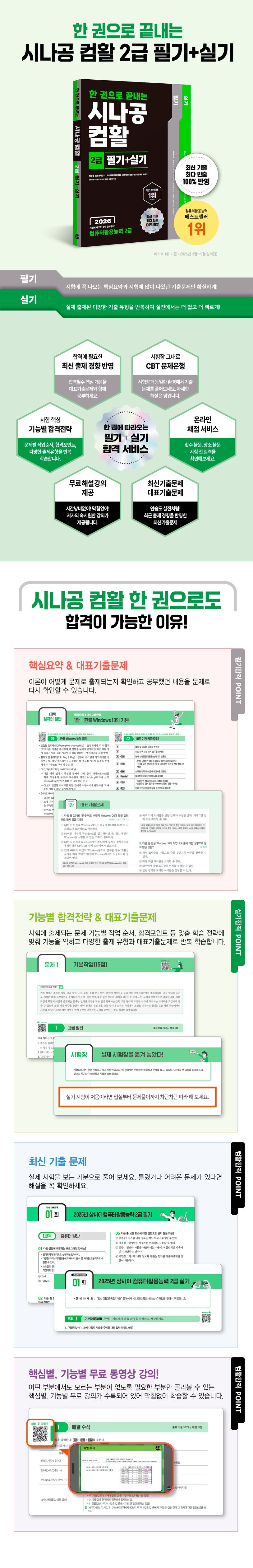 수험생의마음으로만든책시나공최대한단시간에취득할수있도록노력했습니다.자격증취득을목적으로구성된만큼이론상중요할지라도시험문제와거리가있는내용은배제했습니다.또지금까지출제된모든기출문제를유형별로분석하여합격이가능한수준을정한후,출제비중이낮은내용은과감히빼고중요한것은확실하게표시해둠으로써어떠한변형문제가나오더라도대처할수있도록최대한자세하고쉽게설명했습니다.동영상강의를제공합니다.〈한권으로끝내는시나공컴활2급필기+실기〉교재는컴퓨터관련초보자도수월하게공부할수있도록자세하고쉬운설명으로구성되어있지만,수험생의상황에따라학습에어려움을느낄수있습니다.이런분들을위해교재내용의어려운부분을동영상강의로제공합니다.본문의QR코드를스캔하면명쾌하고시원한저자직강동영상강의로막힘없이학습을이어갈수있습니다.-시나공FAQ-Q.시나공홈페이지에서어떤자료를받아볼수있나요?A.시나공홈페이지에서는자격증별로제공되는강의외에도여러시험대비자료를받아보실수있습니다.새로운기출문제가꾸준히업데이트되며,실습파일,핵심요약집을비롯하여실기특강과다양한강의가제공됩니다.자격증종목을선택한후,구매도서에맞는자료를내려받아학습하세요.Q.도서명앞에연도가붙는이유는무엇인가요?작년판과차이점이무엇이죠?A.시나공앞에연도가붙는이유는전년도시험경향을완벽하게반영했음을나타내기위해서입니다.시나공은멈춰있지않고매년변화하는시험문제와유형,출제경향에맞춰같이나아갑니다.Q.실기시험에서시행처에서사용하는버전이MSOfficeLTSC2021라고하던데,가정에서사용하는OfficeProfessional버전과의차이점이뭔가요?A.MSOfficeLTSC는기업용라이선스로개인적으로는사용이어렵습니다.시나공도서는시험장환경에맞춰LTSC2021버전으로제작되었습니다.따라서가정에서사용하는OfficeProfessional버전으로보는화면과도서내표기가다를수있습니다.해당부분은〈전문가의조언〉을통해차이점을안내하고있으므로학습하시는데전혀지장이없습니다.