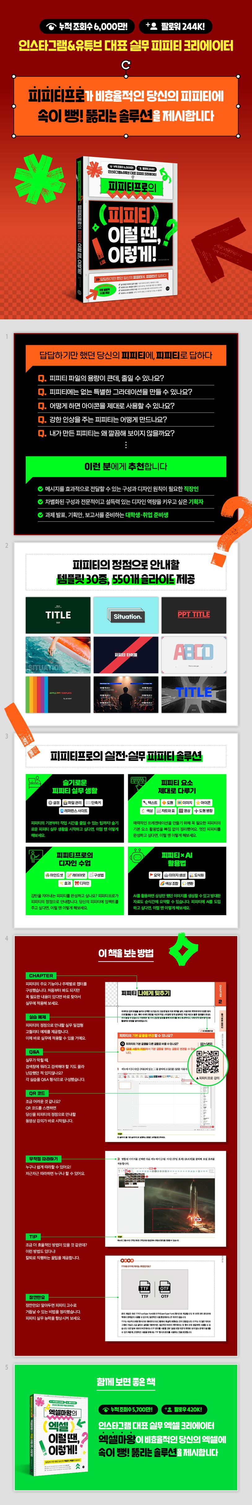 그래서저는조금만배워도눈에띄는차이를만들어낼수있는활용법을담은책을집필하고자했습니다.『피피티,이럴땐이렇게』는단순히피피티의기능만을설명하지않습니다.실무에서마주할수있는다양한상황속에서피피티기능이어떻게쓰이는지에집중합니다.메시지를효과적으로전달하는구성방법,매력적인문서를완성하는디자인원칙,그리고작업속도를높일수있는실질적인해결책까지함께제시합니다.