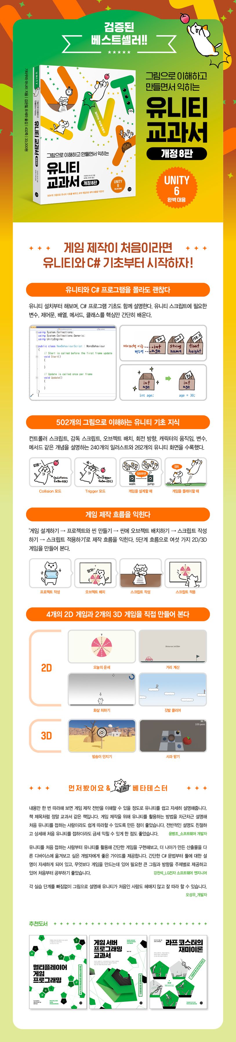 [유니티 교과서, 개정8판]은 유니티를 사용해 2D/3D 게임과 애니메이션을 만들면서 유니티 기초 지식과 함께 게임 제작 흐름을 익히는 것을 목적으로 한다. 유니티를 설치한 후 C# 핵심 문법을 학습하고, 이어서 여섯 가지 2D/3D 게임을 ‘게임 설계하기 → 프로젝트와 씬 만들기 → 씬에 오브젝트 배치하기 → 스크립트 작성하기 → 스크립트 적용하기’ 단계로 만들며 게임 제작 흐름을 익힌다. 만든 게임은 스마트폰에 넣어 실행해볼 수 있다. 유니티 6 버전에서 테스트했고, 예제 소스를 제공하기 때문에 초보자들도 무리 없이 학습할 수 있다.