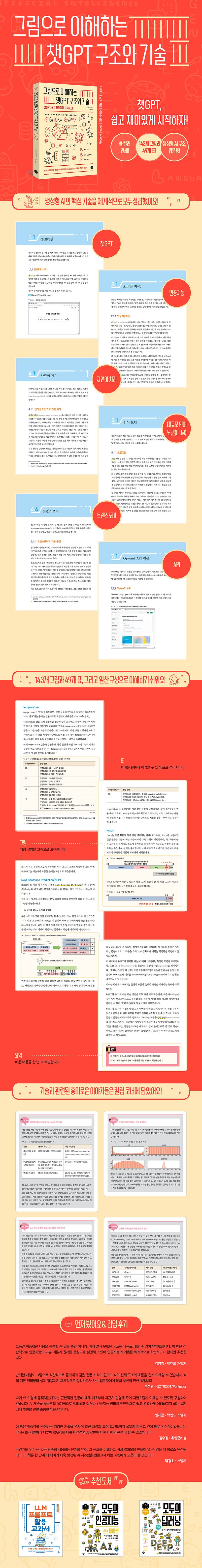 챗GPT는어떻게작동하는가?쉽고빠르게이해하는챗GPT의구조와원리!생성형AI를활용하는책들이주를이루고있지만,기술의본질을이해하지못한다면응용하고활용하는데는한계가있습니다.활용법은금세바뀌고도구자체도빠르게진화합니다.하지만구조와원리를깊이이해해두면,새로운버전이등장해활용법이변하더라도당황하지않고안정적으로대응할수있습니다.따라서AI를더잘활용하고AI를다양한분야에적용하고싶다면,AI의원리를알아두는것이반드시필요합니다.이책은챗GPT의높은범용성을가능하한핵심기술인대규모언어모델(LLM)의구조와원리를다룹니다.뉴럴네트워크,양자화기반모델,트랜스포머,스케일링법칙,RAG,파인튜닝까지생성형AI의기반을이루는주요개념과메커니즘을체계적으로설명합니다.또한AI의성능과정확도를높이는요소부터응용가능성과활용전망까지폭넓게고찰합니다.생성형AI를업무에활용하고있거나다른기술에접목해야하는독자에게강력하게추천하는책입니다.