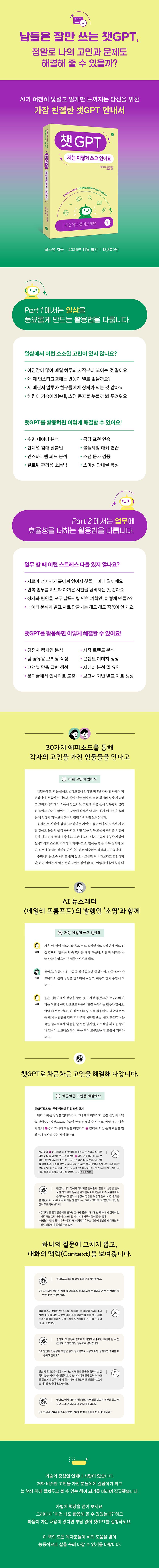 챗GPT를 처음 시작하는 독자들에게 길잡이가 되고, 늘 책상 위에 펼쳐두고 볼 수 있는 책이 되기를 바라는 마음으로 집필했습니다. 가벼운 마음으로 책장을 넘기다 “이건 나도 활용해 볼 수 있겠는데?” 하고 마음이 가는 내용이 있다면 부담 없이 챗GPT를 실행해 보세요. 책을 읽어 나가며 AI를 일상에 어떻게 적용할 수 있을지, 앞으로 이 기술을 어떤 시선으로 바라봐야 할지에 대한 인사이트를 자연스럽게 얻을 수 있을 것입니다.