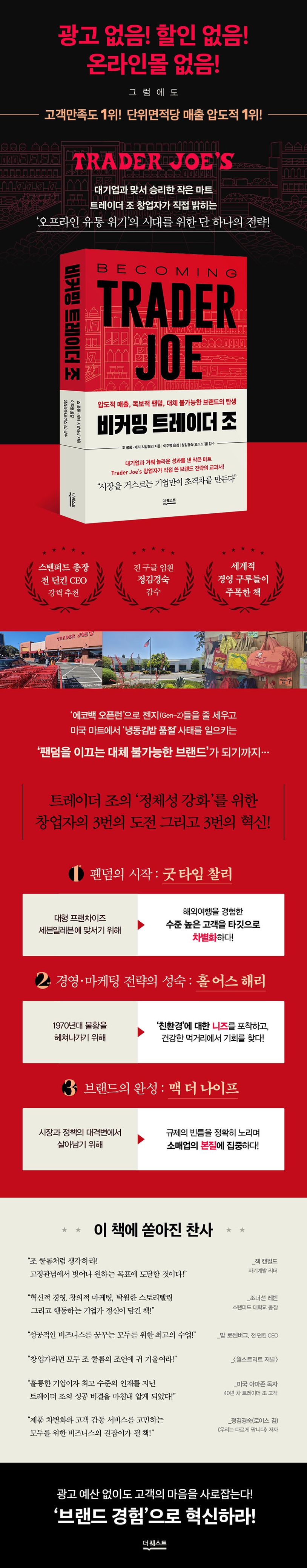 대중에게트레이더조는여전히‘에코백’과‘냉동김밥’을파는미국마트로만알려져있다.그러나영업,마케팅,경영전략을고민하는실무자들에게트레이더조는미국소비자가가장신뢰하는브랜드이자,‘작은동네슈퍼마켓’감성으로유통공룡들과맞서승리한전례없는성공기업으로평가받는다.