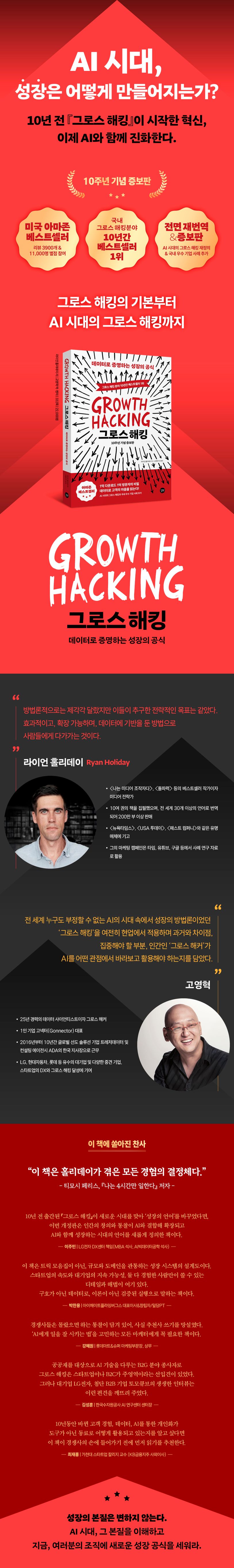 [STEP1]그로스해킹은제품시장적합성에서시작한다__어떻게PMF를얻을수있는가?__피드백과친해지기[STEP2]나만의그로스해킹찾기__모든사람이아니다,딱맞는사람__기술적으로들어가보자[STEP3]1을2로만들고,2를4로만드는입소문효과__선전__입소문을내는그로스해킹[STEP4]그로스해킹절차의마무리:유지와최적화__항상성능개선하기__유지와최적화를확장하기__나의변화:배운것을실행으로옮기기__제품시장적합성(PMF)__성장과관심__입소문효과__최적화와유지__마케팅의미래후기__1단계__2단계__3단계__4단계__결론그로스해킹용어사전자주묻는질문과답변그로스해커되기:다음단계__블로그및개인웹사이트__책__프레젠테이션,쇼,수업__그로스해커콘퍼런스[한국우수스타트업그로스해킹모범사례]편역자이야기__시장과서비스,조직을성장시키는그로스해킹:젤리버스김세중대표__그로스해킹을이용한고객과시장의발굴__그로스해킹의답은고객의서비스이용관찰에있다__고객은최고로강력한우리편__글로벌라이제이션의시작은로컬라이제이션__조직에대한그로스해킹성과가있는마케팅을효율적으로:박지희부사장__배달음식점광고가아닌배달주문처리서비스__IPTV광고의신기원을이룩한요기요__서비스본질을혁신한요기요의그로스해킹__박지희부사장,그리고팀고객을위한막노동에서답을찾은그로스해킹초보:헬로마켓한상협공동창업자__모바일이답이라는것을알려준제품시장적합성__사용자입장이되는것이그로스해킹의정답__고객과소통을하는공간과시간을만들어야한다__그로스해킹을대하는우리자세서비스를이용한서비스디테일의끊임없는개선:위즈돔한상엽대표__서비스근간에대한실험을토대로피벗에성공__서비스핵심을결정하는A/B테스트__디테일이힘,디테일로구현되는그로스해킹__오프라인은사용자반응분석이핵심인터뷰에서배워야할점[AI시대의그로스해킹과우수기업사례]AI시대,그로스해킹재정의__들어가며:그로스해킹의죽음과재탄생__AI가바꾼게임룰__AgenticAI:도구에서동료로__2025년이후,그로스해킹의미래__맺음말:변화를기회로토모큐브:고객도모르는니즈를데이터로찾아내다:박용근토모큐브대표이사/이수민토모큐브상무이사__고객도모르는고객의마음,데이터로읽다__성장하는시장을선택하라,그리고빠르게실패하라__스몰데이터의힘:첫미팅이전환율을좌우한다__‘지금이아니면안된다’:시기상조라는변명을넘어서__샤이한고객의마음을여는데이터활용법__AI시대의그로스해킹:문제에집중하면도구는따라온다__마무리:데이터가이끄는성장,사람이만드는미래제조업의구독경제전환,데이터로2년만에유니콘달성하다:LG전자구독IT운영팀전재현팀장__정수기에서시작된2조원구독경제__정성분석의한계,행동데이터로반론을잠재우다__상담원의케미컬:1등+1등이최고가아니다__케어매니저를99%만족시킨AI도입__데이터품질이먼저다:GarbageIn,GarbageOut__구독경제의미래:고객과평생함께하는법