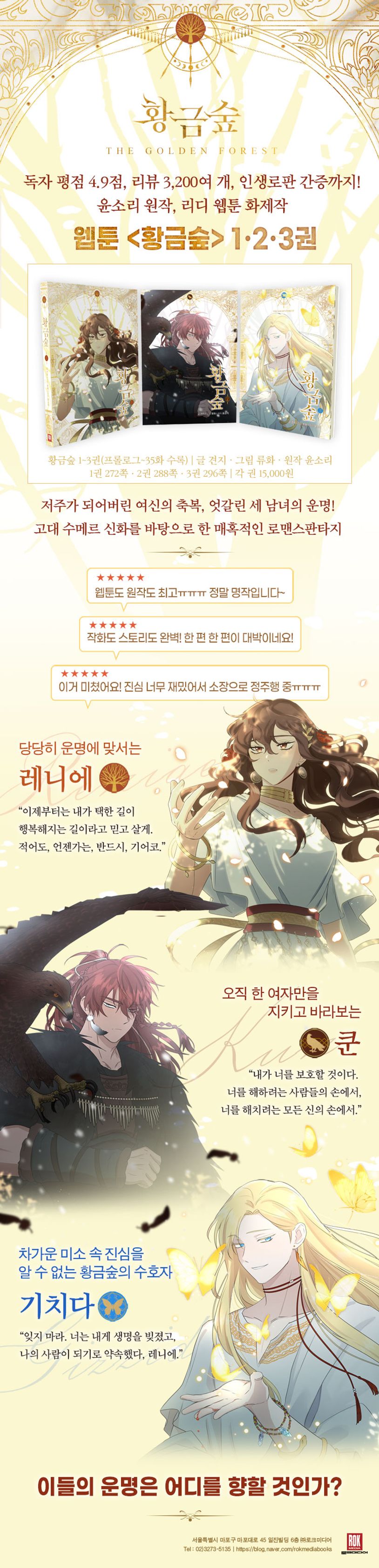 원작 소설로 먼저 접한 이들까지 입을 모아 “머릿속에서 상상하던 장면들을 찰떡같이 풀어냈다”, “원작과 번갈아가며 정주행하게 만들었다”는 마성의 웹툰 〈황금숲〉이, 마침내 단행본으로 출간된다. 사랑과 집착, 증오와 연민으로 얽히고설킨 세 남녀의 운명을 신화에 빗대어 풀어낸 이 신비롭고도 매혹적인 삼각 로맨스가 독자들의 마음을 다시금 흔들어놓을 것이다.