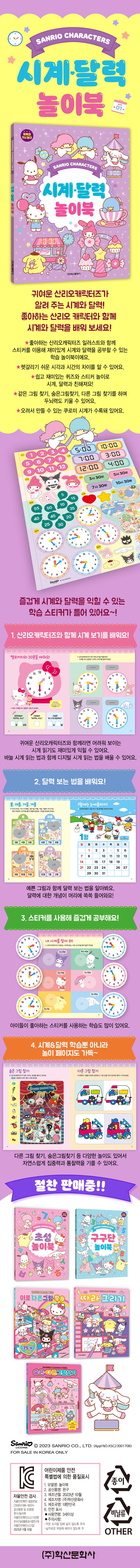*좋아하는 산리오캐릭터즈 일러스트와 함께 스티커를 이용해 재미있게 시계와 달력을 공부할 수 있는 학습 놀이북이에요.