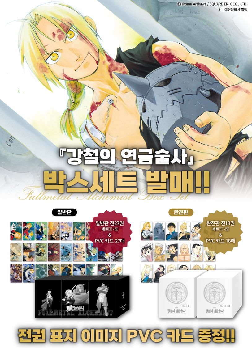 강철의 연금술사 전27권 박스세트 발매!! 강철의 연금술사 전권과 전권 표지 이미지 PVC카드(총 27매)가 포함된 박스세트가 발매된다. 1~9권과 PVC카드 9매가 포함된 박스세트1, 10~18권과 PVC카드 9매가 포함된 박스세트2, 19~27권과 PVC카드 9매가 포함된 박스세트3으로 각각 구성되는 강철의 연금술사 박스세트는 강철의 연금술사 팬이라면 반드시 소장해야 될 상품이다.