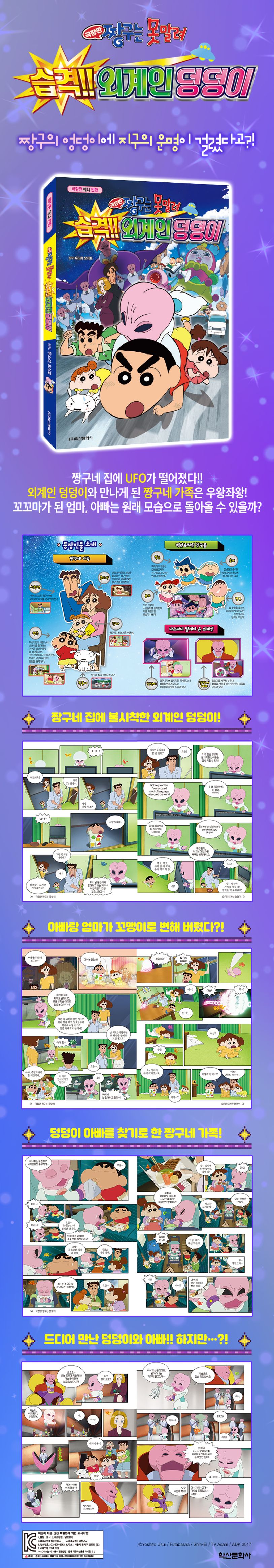 천방지축 개구쟁이 짱구가 외계인을 만났다?!! 언제나 소란스러운 짱구네 집에 유성이 떨어졌다고?! 알고 보니 그건 외계인이 타고 있는 UFO!! 게다가 그 외계인 덩덩이는 짱구네 아빠와 엄마를 꼬마로 만들어 버린다. 부모님을 다시 어른으로 되돌리기 위해 짱구네 가족의 대모험이 시작되는…. 짱구와 외계인 덩덩이의 종족을 초월한 우정! 그리고 가족을 위해 희생하는 짱구네 엄마와 아빠의 가슴 찡한 모습이 가득 담겨 있는 감동 가득한 애니 만화!