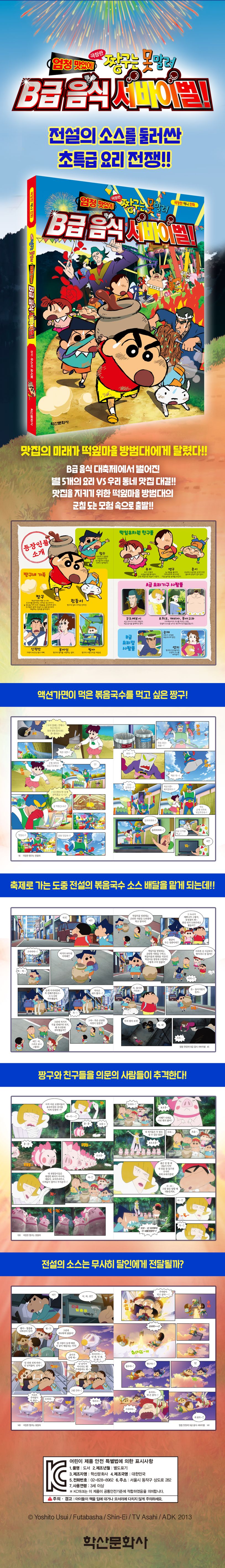 입소문 난 볶음국수를 먹기 위해 모험을 떠나는 짱구와 친구들의 이야기가 담긴 『짱구는 못말려 극장판: 엄청 맛있어! B급 음식 서바이벌!』에서는 최고급 음식인 A급 요리기구와 서민들의 음식인 B급 요리의 대결이 펼쳐진다.