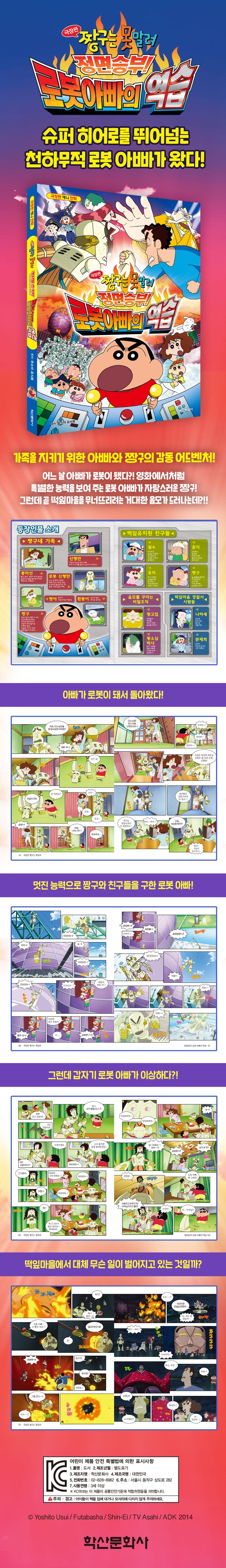 [짱구는 못말려 극장판 : 정면승부! 로봇아빠의 역습]에는 역대 슈퍼 히어로를 뛰어넘는 신개념 로봇 아빠가 등장한다. 로봇 만화에 열광하며 ‘로봇 합체’를 외치는 짱구 앞에 나타난 로봇 아빠. 강하고 단단한 신체로 위기의 짱구를 구하는 것은 물론 빨래, 청소, 집수리 등 집안일과 회사 일까지 만랩인 로봇 아빠가 마음에 쏙 드는 짱구! 세상 그 어떤 슈퍼 히어로보다 멋진 로봇 아빠는 짱구와 짱구 가족뿐만 아니라 떡잎마을에 큰 변화를 몰고 온다. 하지만 이런 로봇 아빠 뒤엔 거대한 음모가 도사리고 있었는데…. 그리고 진짜 아빠는 어디에 있는 걸까? 로봇 아빠와 짱구 가족의 멋진 슈퍼 파워를 생생한 만화로 즐겨 보자!