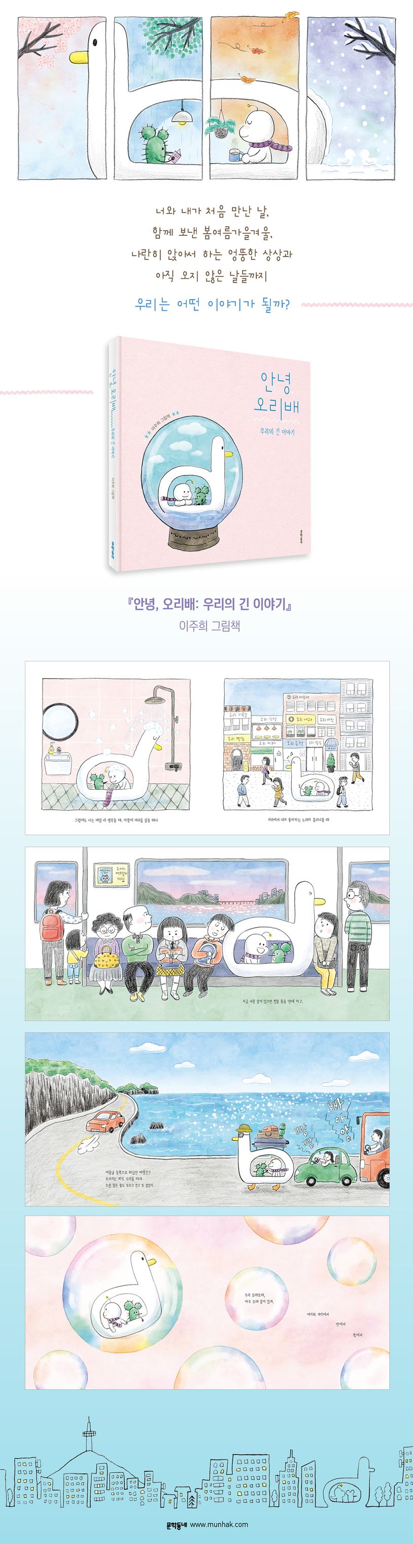 세상 속 수많은 사람 중 하필 너와 내가, 그날 그곳에서 만나 사랑하게 될 확률은 얼마나 될까? 『안녕, 오리배』는 서로 다른 길을 걸어오던 두 사람이 우연히 마주치며 시작되는 이야기다. 두 개의 길이 만나 하나로 합쳐질 때, 완전히 별개였던 너와 나의 세계는 순식간에 교차하고 확장하며 '우리의 세계'를 탄생시킨다. 지나온 하루는 일기가, 지나온 인생은 일대기가 되는 것처럼 우리는 누구나 자기 삶의 주인공으로서 한 사람분의 이야기를 지니고 있다. 그리고 그 하나하나의 이야기는 살아가며 마주치는 많은 우연과 필연에 의해 서로 중첩되기도, 끊어지기도 하며 지표에 그려지는 무늬가 된다. 이주희 작가는 우리 삶과 맞닿아 있는 이 이야기의 본질을 포착해, 두 사람의 역사(story)를 다정한 한 권의 그림책으로 만들어 냈다.