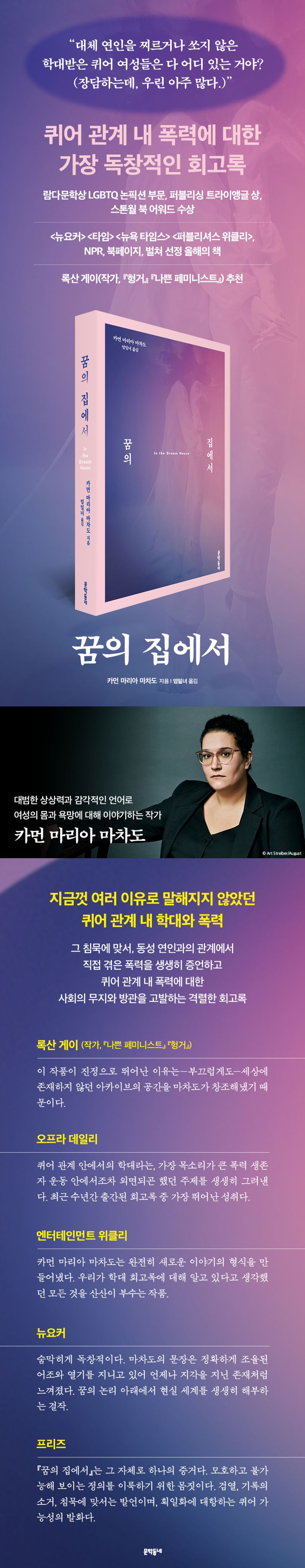 대범한 상상력과 감각적인 언어로 여성의 몸과 욕망에 대해 이야기하는 소설집 『그녀의 몸과 타인들의 파티』을 통해 문단에 반향을 일으킨 작가 카먼 마리아 마차도가 퀴어 관계의 면면을 정직하게 해부하는 회고록 『꿈의 집에서』로 돌아왔다. “퀴어 역사상 새로운 고전의 탄생”이라는 평을 들은 이 작품은 람다문학상 LGBTQ 논픽션 부문을 수상하고 〈뉴요커〉 〈타임〉 〈뉴욕 타임스〉 〈퍼블리셔스 위클리〉 등에서 올해의 책으로 선정되었다.