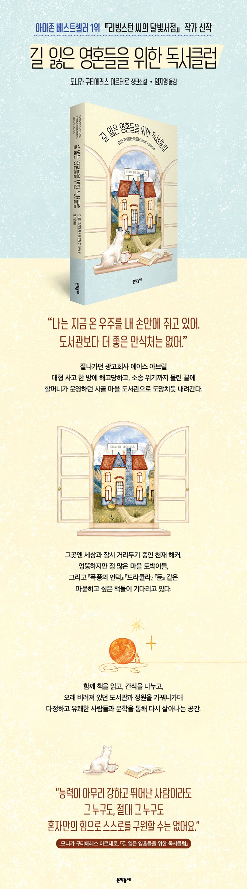 아마존 베스트셀러 1위를 기록하며 전 세계 10여 개국에 소개된 『리빙스턴 씨의 달빛서점』의 작가 모니카 구티에레스 아르테로의 신작 『길 잃은 영혼들을 위한 독서클럽』이 출간되었다. 전작의 런던 서점에서 스페인 카탈루냐 지방의 작은 마을 도서관으로 배경을 옮겨와, 주인공 아브릴이 운영하는 독서클럽을 중심으로 문학을 향한 사랑, 사람들 사이의 유대와 우정, 일상의 행복한 순간과 설레는 로맨스를 담아낸 ‘필굿 소설’이다.