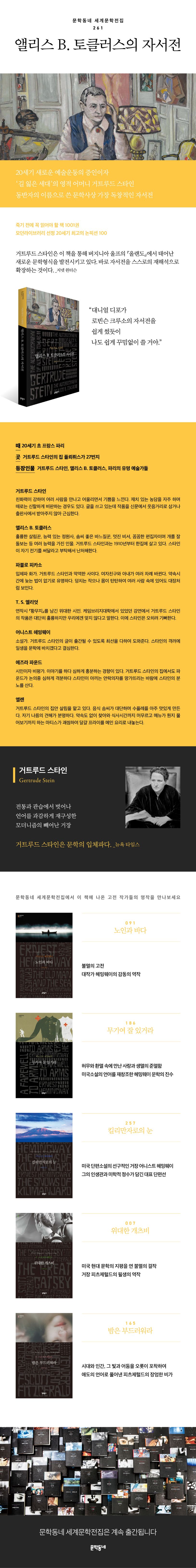 벨에포크를 지나 1차대전 전후 20세기 초 프랑스 파리에서는 그전과는 다른 새로운 예술운동의 조짐이 여럿 요동치고 있었다. 그 용틀임의 한복판에서 역동적인 예술 사조의 탄생을 지켜보고, 격려하고, 그것에 문학가로서 직접 참여한 이가 거트루드 스타인이다. 그녀는 파리 플뢰뤼스가 27번지에 위치한 자신의 스튜디오를 예술가들이 모여 인생을 이야기하고 예술론을 펼칠 수 있는 살롱 공간으로 내어주었다. 이는 우디 앨런의 영화 〈미드나잇 인 파리〉에 그려진 바 있다. 그녀는 당시 아직 무명이었던 현대 거장 화가들의 작품을 사들여 그들의 작품활동을 뒷받침해주었으며, 전후 인생의 지향점을 잃은 세대를 가리키는 ‘길 잃은 세대’라는 명칭을 고안해냈고, 모더니즘이라는 새로운 사조를 문학의 영역에서 확장시켜나가는 등 다양한 방면으로 기여했다. 이처럼 예술가들의 정신적 지주로서의 거트루드 스타인은 잘 알려져 있으나, 그간 “문학의 입체파”라고 〈뉴욕 타임스〉가 극찬할 만큼 다채로운 그녀의 작품세계는 아쉽게도 국내에 잘 알려져 있지 않았다. 이 책 『앨리스 B. 토클러스의 자서전』은 국내 독자들로 하여금 스타인만의 고유한 문학세계로 안내하는 입문서이자 당대 예술의 지형을 살필 수 있는 시대적 길잡이 역할도 해줄 것이다.