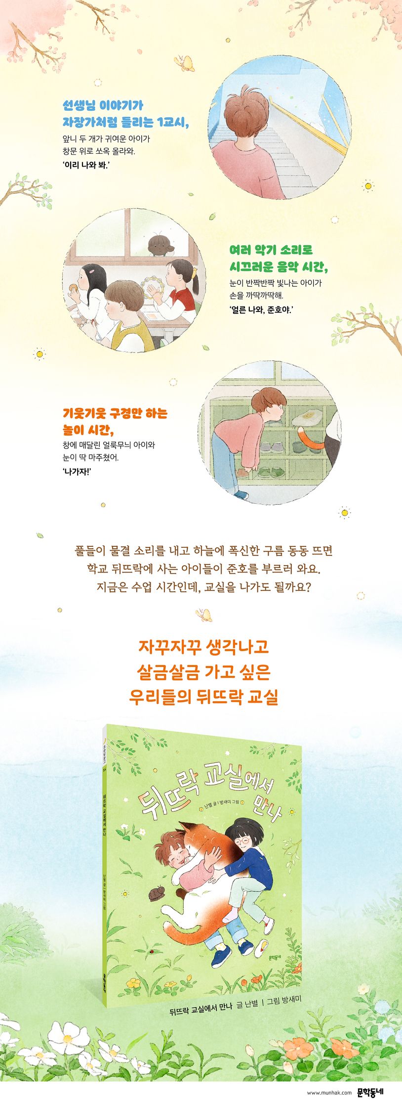 난별 작가의 다정한 문장과 방새미 화가의 따스한 그림은 책장을 넘길 때마다 살랑살랑 마음을 간지럽힙니다. 사랑스러운 동물 친구들과 싱그러운 뒤뜨락의 초록은 들여다볼수록 평온해지고요. 이처럼 『뒤뜨락 교실에서 만나』는 교실에서 느끼는 답답함을 자기의 속도로 극복할 수 있도록, 그리하여 학교라는 공간을 긍정할 수 있도록 아이들을 섬세하게 격려하는 이야기입니다. 학교생활을 어려워하는 아이와 함께 읽고 생각을 나누어 보세요. 학교는 생각지 못한 즐거운 사건이 일어나는 곳, 교실은 나와 마음이 닮은 친구들이 모여 있는 곳이라고 알려 주는 ‘뒤뜨락 교실’로 여러분을 초대합니다. 시루, 콩이, 나물이와 함께 기다리고 있을게요. “모두 뒤뜨락 교실에서 만나!”
