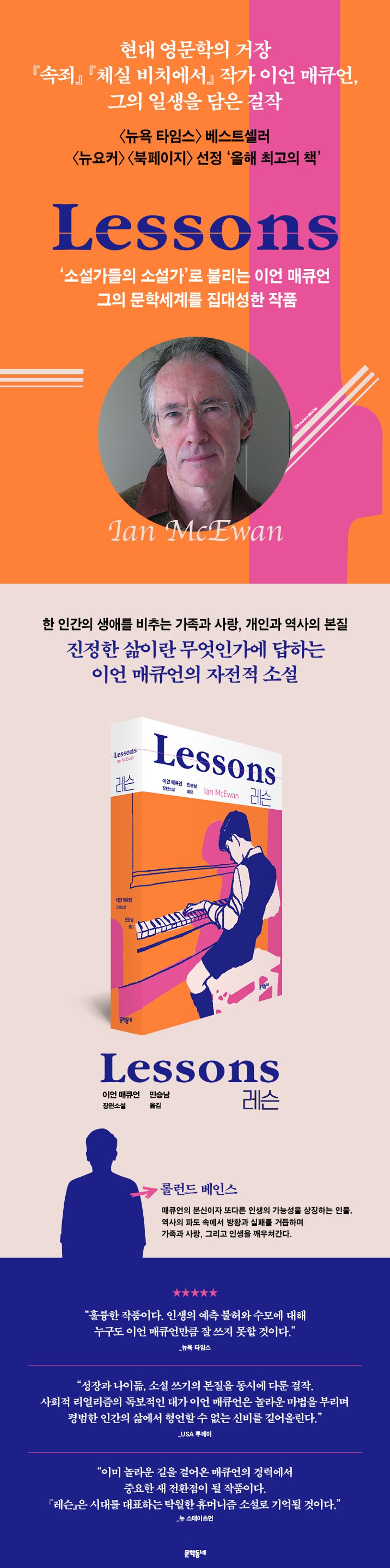 제목 ‘레슨(Lessons)’에는 두 가지 의미가 있다. 피아노 레슨과 인생의 교훈이 그것이다. 미리엄은 어리숙한 소년인 롤런드에게 극단적인 사랑의 감정을 일깨울 뿐만 아니라 삶의 방향과 가치관까지 바꿔버린다. 롤런드의 인생 전체에 그림자를 드리우는 그녀의 존재감은 사랑과 원한, 용서에 대한 교훈을 일깨운다. 또한 미소 냉전, 베를린장벽 붕괴, 체르노빌 원전 사고, 코로나 사태 등 굵직한 역사적 사건을 헤치며 살아온 롤런드의 일생은 역사가 개인의 삶에 어떻게 영향을 미치는지, 진정 행복한 삶이란 무엇인지에 대한 물음을 던지며 우리의 삶을 되돌아보게 한다.