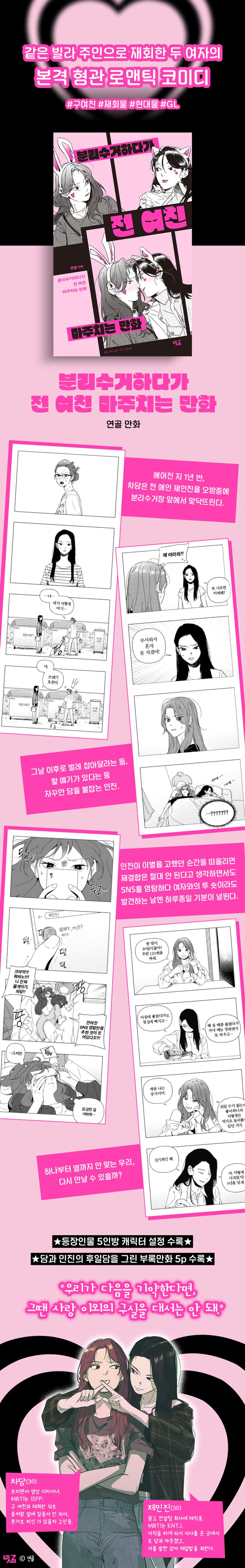 차담은 오밤중에 전 여자친구 제민진과 아파트 분리수거함 앞에서 마주친다. 마주친 첫날 이후로 벌레를 잡아달라는 둥, 할 얘기가 있다는 둥 자꾸만 담을 붙잡는 민진. 담은 그런 민진을 밀어내지만, 헤어진 후 더 예뻐진 것만 같은 민진에게 자꾸만 눈길이 가는 걸 막을 수 없다. 과연 두 사람은 다시 만날 수 있을까? 헤어진 두 여자의 재회를 그린 GL 장르의 로맨틱 코미디. 전1권 완결.