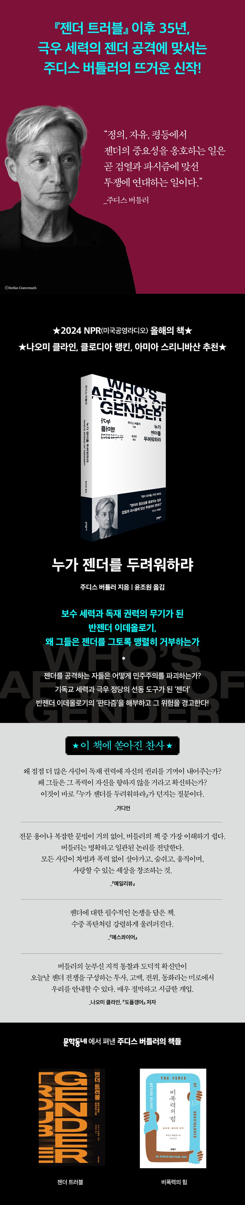 퀴어 이론과 젠더 연구의 권위자이자 세계적 석학인 주디스 버틀러의 신작, 『누가 젠더를 두려워하랴』가 문학동네에서 출간되었다. 『젠더 트러블』 이후 35년 만에 ‘젠더’에 천착해 쓴 이 책에서 버틀러는 젠더에 대한 실체 없는 공포가 어떻게 정치, 사회, 문화에 영향을 미치는지, 그로 인해 어떤 삶들이 실제로 파괴되고 있는지를 이론과 현장 양쪽을 넘나들며 낱낱이 파헤친다. '젠더'를 악마화하는 이들은 대체 누구이며, 왜 그토록 맹렬히 젠더를 거부하는가? 버틀러는 이 질문에 답하기 위해 종교 집단, 정치 권력, 트랜스 배제적 페미니스트 등 동시대의 젠더에 반대하는 집단을 들여다본다. 반젠더 이데올로기를 퍼뜨리는 이들은 “무언가가 그들의 세계를, 세계 속에서 체현된 그들의 자아 감각을, 그들의 생존에 없어서는 안 될 사회구조를 파괴하고 있다는 확신 같은 느낌”만으로 젠더를 공격한다. 문제는, 이러한 환상이 힘을 얻으면 성소수자 및 젠더소수자, 난민, 이민자, 외국인 등은 국가에 반하는 존재로 여겨져 실질적인 위해를 입게 된다는 사실이다. 이 책은 ‘반젠더’와 ‘가치 수호’ 사이를 비논리적으로 연결하는 우파 집단의 전략과 그에 대한 비판을 명료하고 구체적이며 이해하기 쉬운 언어로 전달하며, 그럼으로써 모든 사람이 살 만한 세상을 만들어가는 데 어떤 인식론적 훈련과 윤리가 필요한지 고민하는 이들에게 힘과 용기, 유용한 통찰을 전한다.