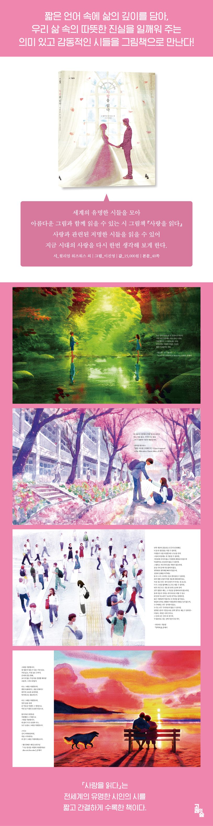『사랑을 읽다』는 어린 시절의 순수한 우정부터 설렘과 그리움, 만남과 이별, 그리고 인생의 다정한 동행까지 두 사람이 함께 걸어 온 사랑의 순간들을 시와 그림으로 아름답게 펼쳐낸 그림책이다.