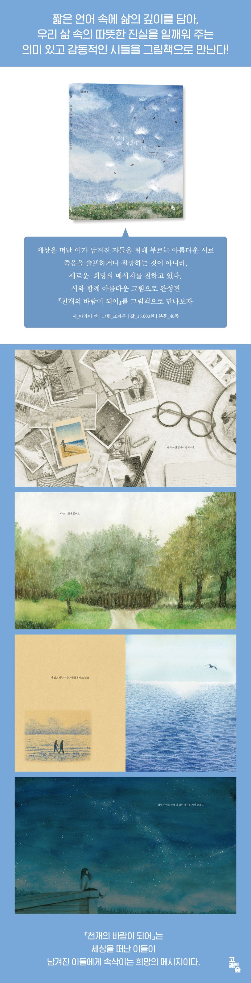 깊은 위로를 전하고 있으며, 이번에 화가 조아름의 섬세한 그림과 함께 그림책으로 만들어졌다.