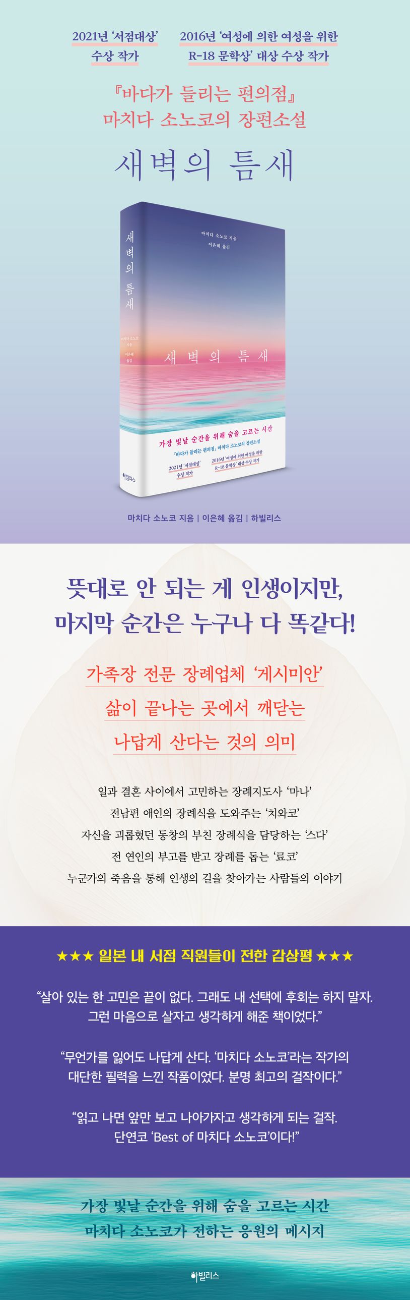 나는 ‘나의 삶’을 살고 있는가? 이 물음에 답하듯, 마치다 소노코는 이 소설에서 세상의 편견에 정면으로 맞서는 사람들의 모습을 그리고 있다. 가족과 연인의 반대에도 장례지도사로서의 삶을 지켜가는 ‘마나’, ‘딜리버리 헬스’ 업체에서 일하면서도 당당했던 ‘나쓰메’, 남편의 충격적인 이혼 요구에도 홀로 딸을 키워낸 ‘치와코’, 괴롭힘을 당한 어린 시절에서 벗어나고자 안간힘을 쓰는 ‘스다’, 미용사로서의 커리어를 인정하지 않는 시댁과 남편의 반대를 뿌리치고 홀로서기를 하는 ‘후코’. 가장 가까운 사람들과의 갈등은 오히려 그들로 하여금 자신의 미래와 삶을 돌아보는 계기가 된다. 그러한 자각을 통해 그들은 자기 삶의 주체로서 한발 더 나아간다. 그들처럼 우리도 ‘새벽’이라는, 무수한 어둠과 무수한 밝음의 그 ‘틈새’를 통과하는 중인지도 모른다. 이 소설을 통해 ‘나다움’의 의미와 진정으로 원하는 삶이 무엇인지 다시금 생각해보게 될 것이다.