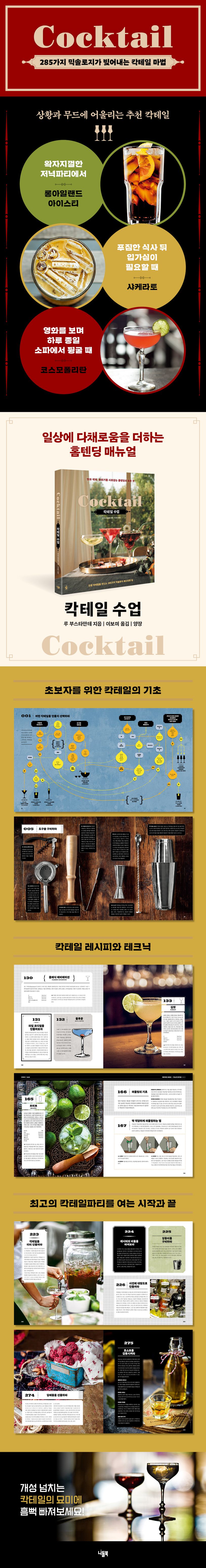 《칵테일 수업》에 모든 게 담겨 있다. 프로처럼 홈 바를 세팅하는 법부터 칵테일 도구를 제대로 활용하는 법, 가벼운 저녁식사나 떠들썩한 파티와 같이 상황과 무드에 맞는 칵테일을 고르고 만드는 법까지, 홈 바텐딩의 정수를 모았다. 세계 최고 바텐더들이 전하는 황금 레시피로 인생 칵테일에 도전하고, 때로는 혼자만의 시간에, 때로는 사람들과 연결되어 완벽하게 칵테일을 즐기는 법을 배워보자.